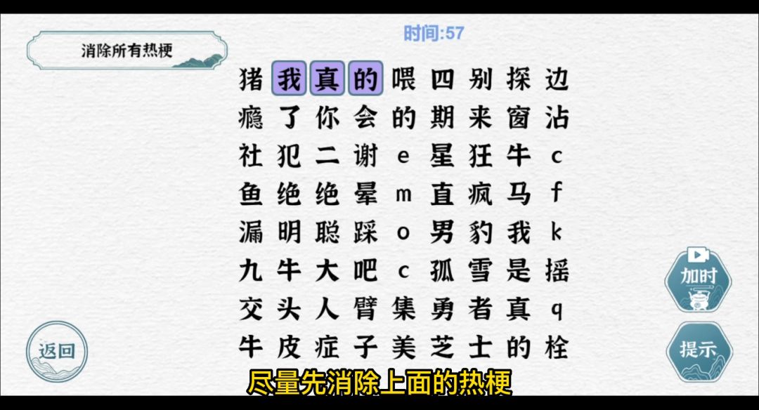 本关的宗旨就是尽量先消除上面的热梗,上面的消除完了再消除下面的热梗,避免由于下方热梗消除完毕后位置错开导致上方热梗无法消除,大家可以按照我的步骤一步步来,建议顺序:我真的会谢、九漏鱼、大聪明、牛头人、社交牛皮症、绝绝子、猪瘾犯了、你二臂吧、集美、come的喂、疯狂星期四、孤勇者、芝士雪豹、踩晕直男、我是真的栓q、牛马摇、弹窗kfc、别来沾边