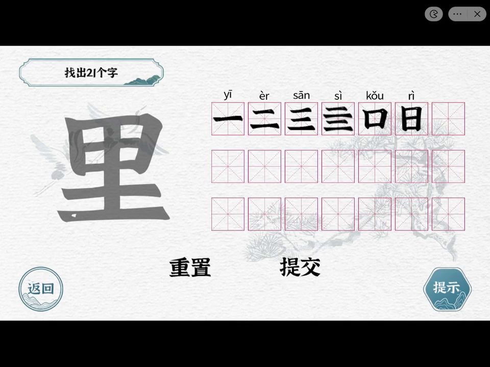 一、二、三、亖(si)、口、日、十、甲、土、干、旦、冂(jiong)、王、丰 里、早、田、上、下、工、圭