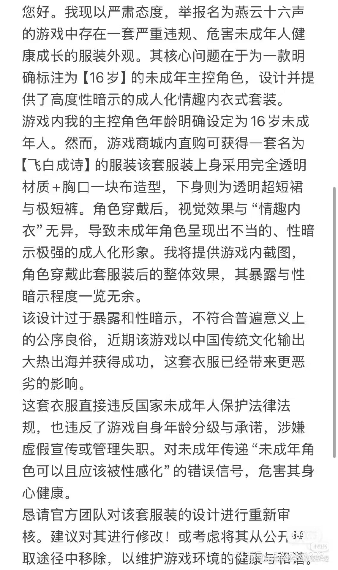 游戏内我的主控角色年龄明确设定为16岁wcn人。然而,游戏商城内直购可获得一套名为【飞白成诗】的服装该套服装上身采用完全透明材质+胸口一块布造型,下身则为透明超短裙与极短裤。角色穿戴后,视觉效果与“情趣内衣”无异,导致wcn角色呈现出不当的、性暗示极强的成人化形象。我将提供游戏内截图,角色穿戴此套服装后的整体效果,其暴露与性暗示程度一览无余。该设计过于暴露和性暗示,不符合普遍意义上的公序良俗,近