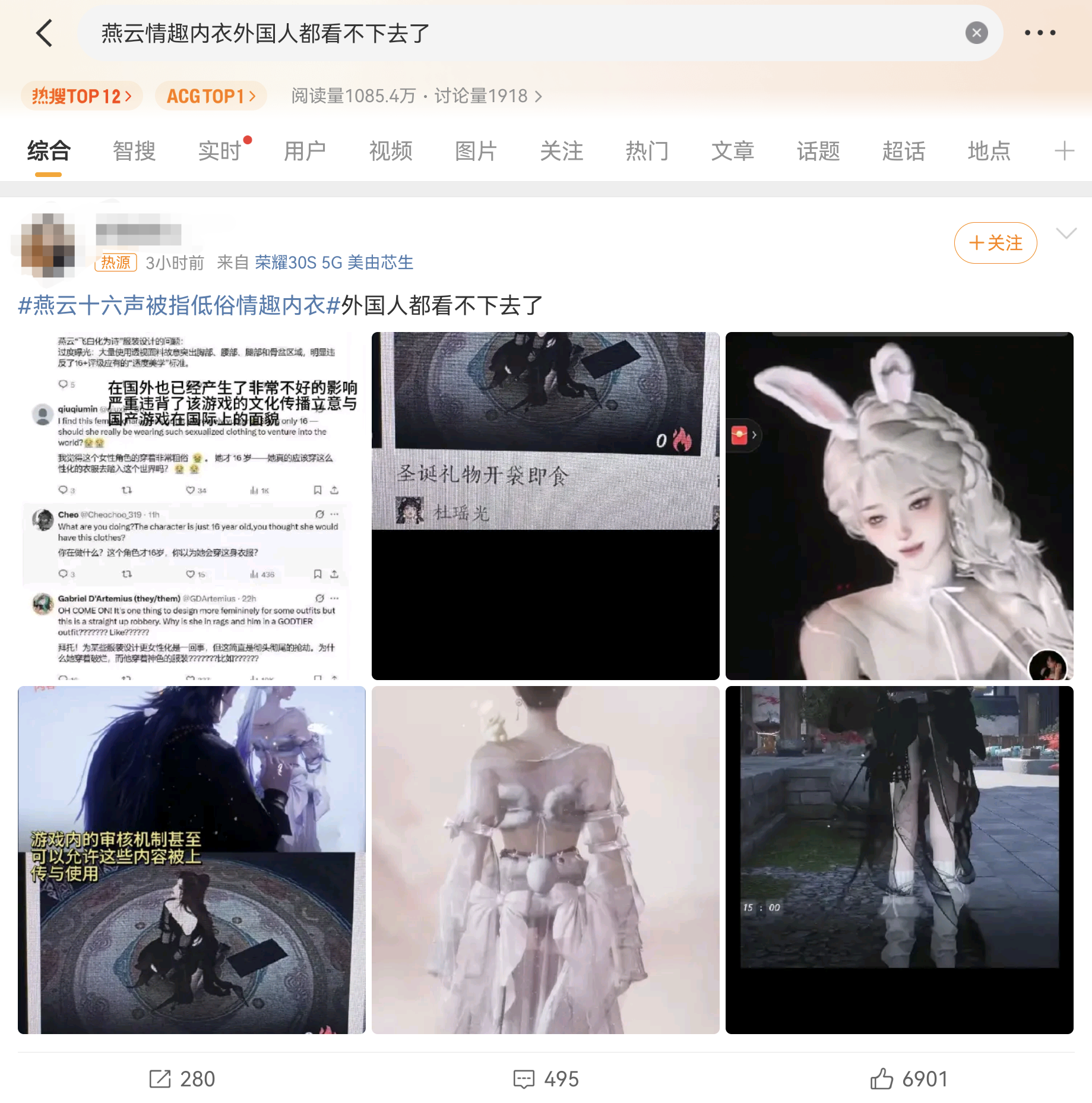 燕云的词条在热搜上挂两天了,这还是周年庆😅。且前20条就占了7条,燕云是要渡劫吗?已知官方在争议后进行了两次调整。先是以“染色BUG”为由微调材质,后又推出“裁造功能”,为女款提供“无绑带”选项,但保留了核心设计。男款则得到了更彻底的覆盖式修改。当然也毫不意外地,此举被部分玩家批评为敷衍,毕竟改动前后区别真不大。也有玩家指出这与游戏早期承诺的“维护武侠严肃性”相悖,
