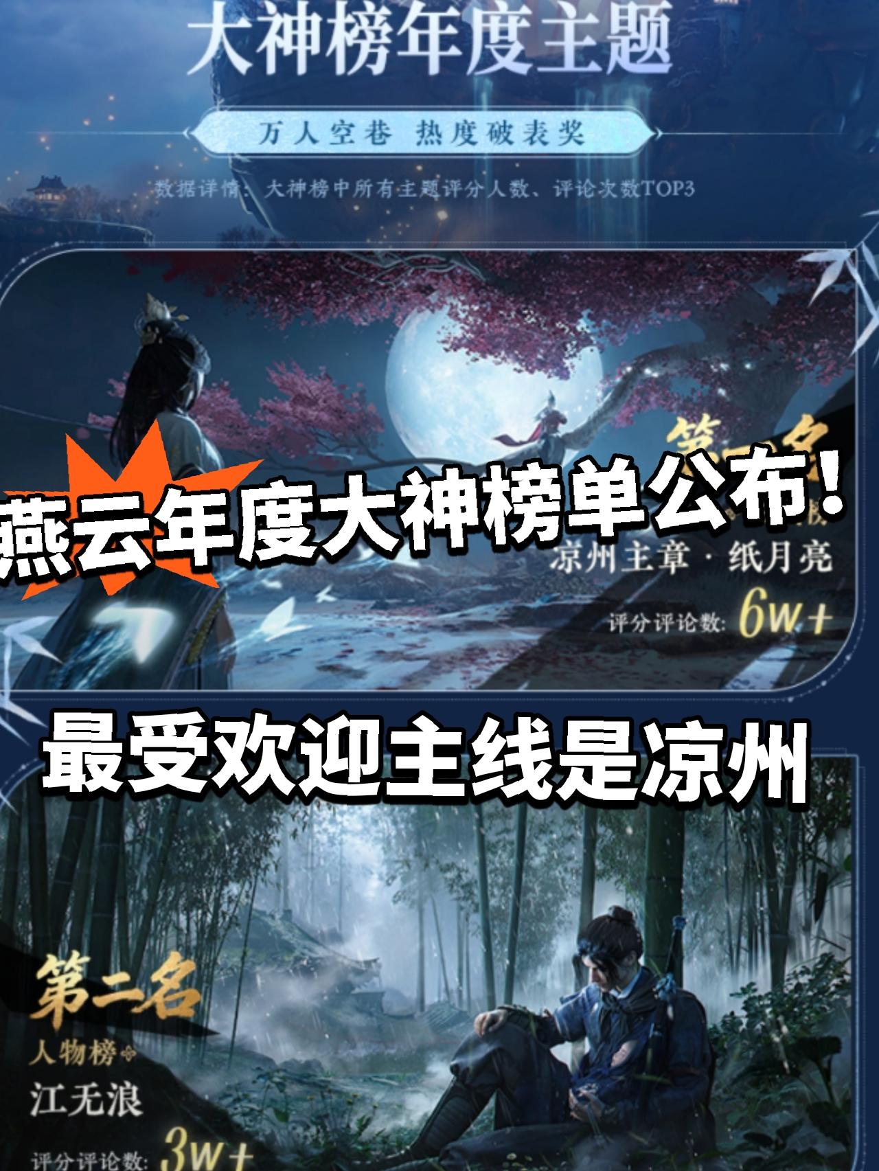 大的来了家人们!近日燕云十六声一周年评分榜单正式出炉了,一公布 玩家们就热议开了!这次一共出了四个榜单,分别是热梗榜、主线剧情榜、地图榜和人物榜,全靠玩家的评分和评论来排名次的。 榜单里凉州主章《纸月亮》最能打,凭着6万多的评分评论数拿下第一名。 第二名是人物榜的江叔,评论数也有3万多。第三名同样是凉州主章,叫《凉州曲》,评论数2万多。这么一对比就看出来了,江叔是真厉害,就他一个角色的讨论度