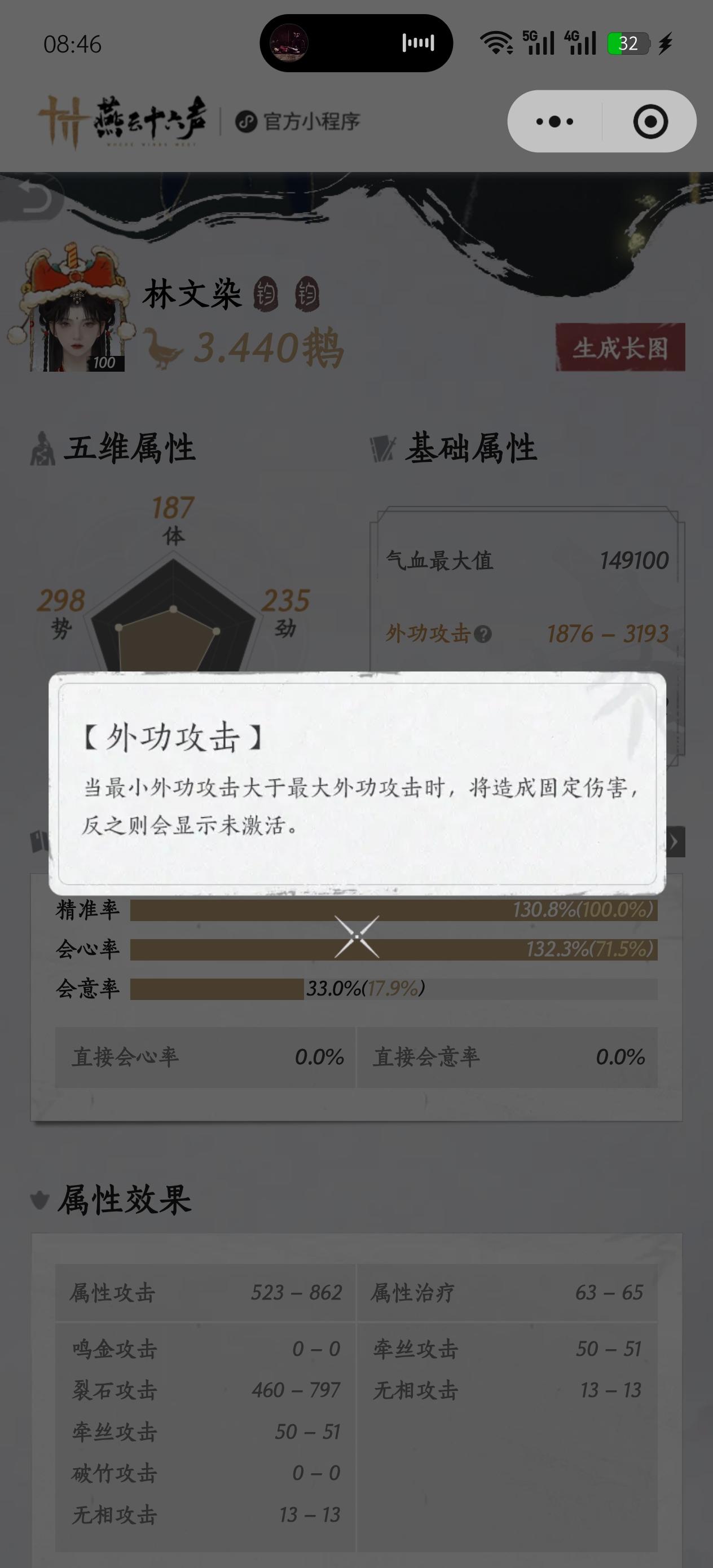 1.游戏进行伤害判定时,先判定精准,再判定会意,最后判定会心。如果触发了会意,就不会触发会心。所以在精准=100%,会意+会心>100%时,是如何互动的?A.先判定会意是否触发,如果未触发会意再独立判定会心,所以此时即便会意率+会心率>100%,仍有(1-会意率)×(1-会心率)出现白字。B.先判定会意是否触发,如果未触发会意,再检测会意+会心之和是否满足100%,如果不满足则按A计算,满足