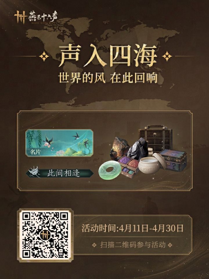 此间风起,自有相逢!端外特别活动【声入四海】现已正式开启,游侠已可前往游戏官网首页(),或扫描下方二维码参与。进入页面后,游侠聆听来自世界各地游侠上传的真实声场。也可通过录制或上传,留下独属于自己的风声。用各自的天地万籁,与世界另一端的应律之人“对话”。我们也为游侠准备了名片、侠名在内的礼物,随着活动进度逐步发放。后续,我们也期待和全球游侠一起,做更多有意义的事!#燕云十六声声入四海 #燕