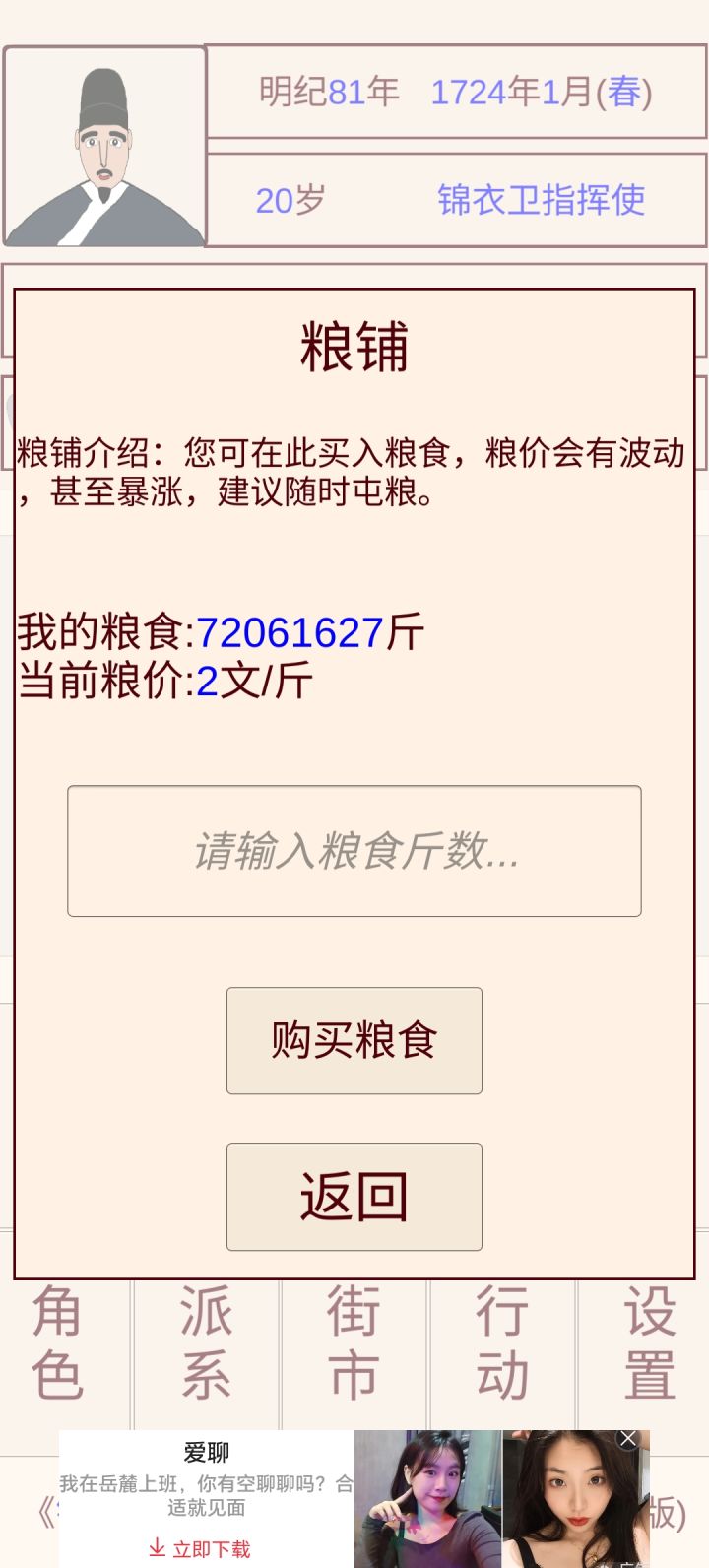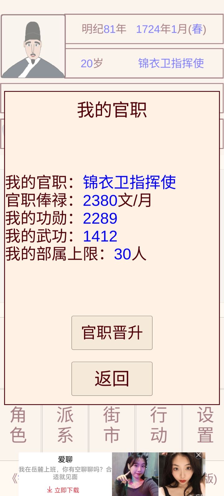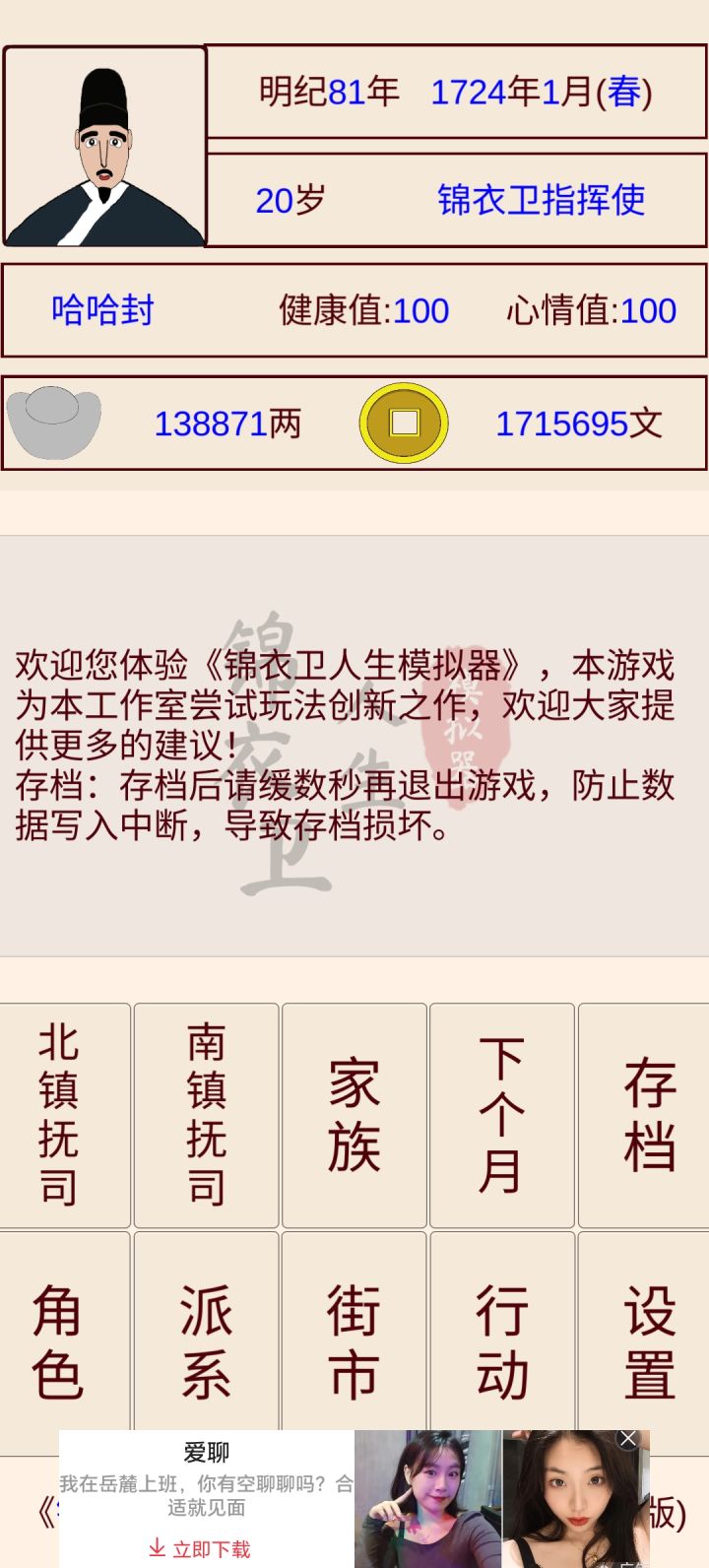 我玩了一次,活到79,官位副千户,有几点问题,想说一下首先,赚钱的形式太单一了,只能通过攒工资,然后存到银行吃利息,我的工资水平大概是前二十年,攒了230两。其次,作为一位锦衣卫的升官使,我感觉这种模式太单一了,大概两代就能实现最高阶层,然后就没了,就像我这样,没了,写完这个评论以后,我也不会再玩了,没啥玩的了