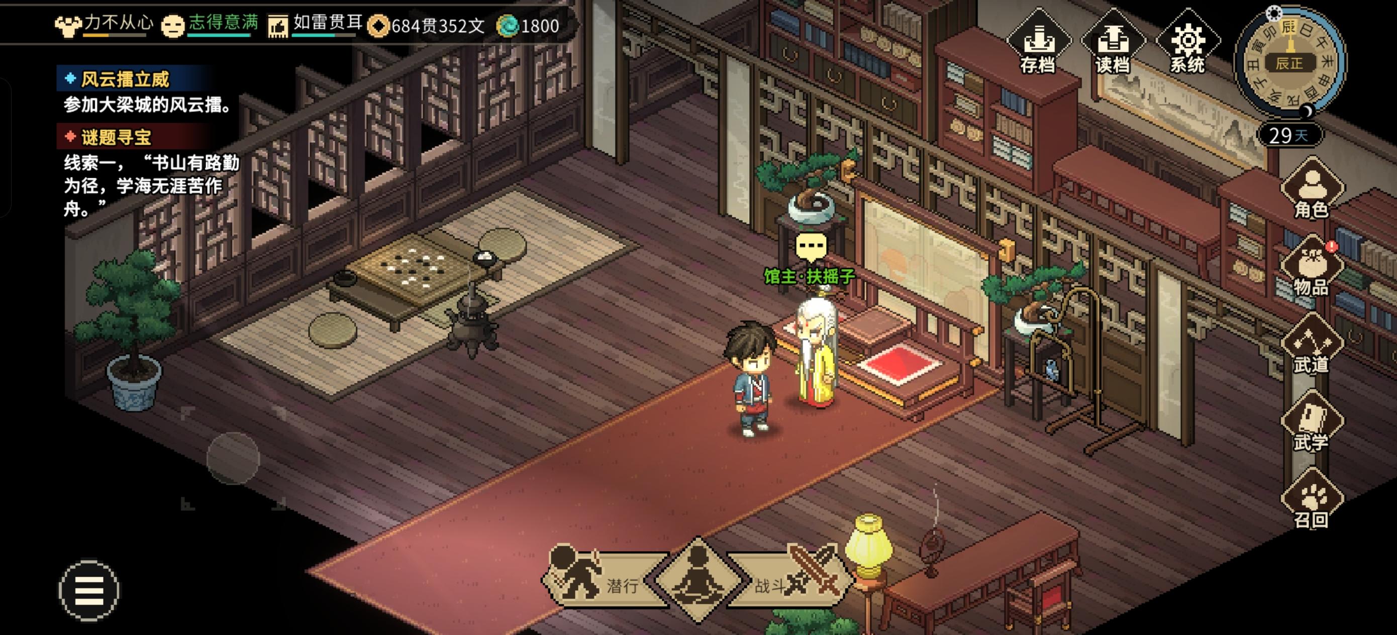 以下是《大侠立志传》的一些攻略要点: 1. 开局选择: - 武器偏好:游戏中武器各有特点,新手推荐选择剑、拳、枪。剑的攻击距离适中,伤害稳定,且初期容易加入剑系门派进行后续发展;拳法则比较灵活,在近身战斗中能发挥较大优势;枪的攻击距离较远,可在安全距离外攻击敌人。 - 初始属性:根据自己想要的发展方向来分配初始属性点。臂力影响物理攻击,体质影响生命值和防御力,敏捷影响行动速度和闪避率等。如果想