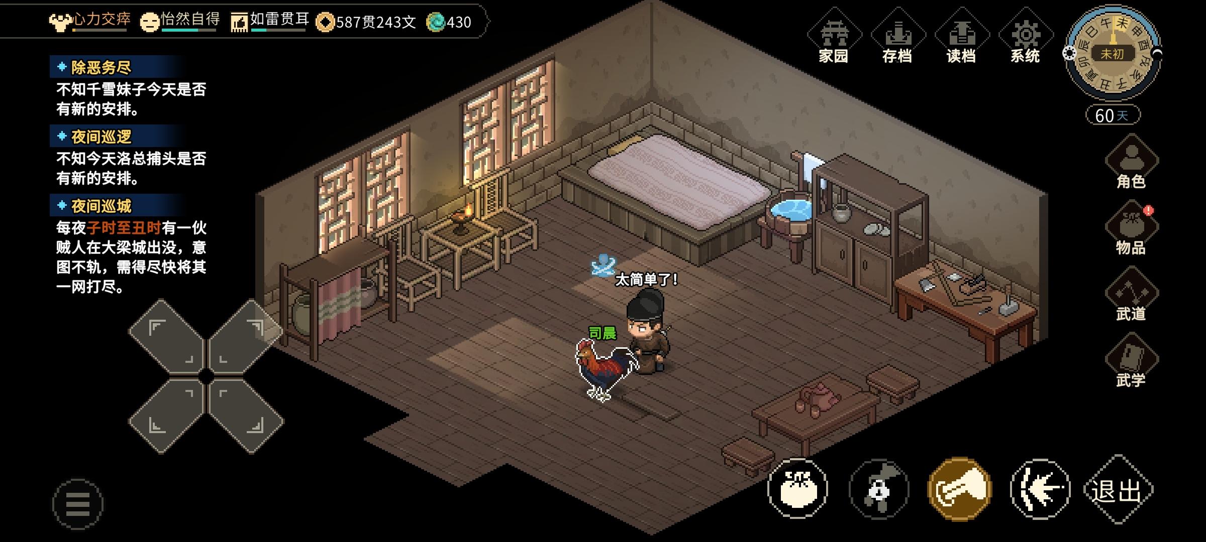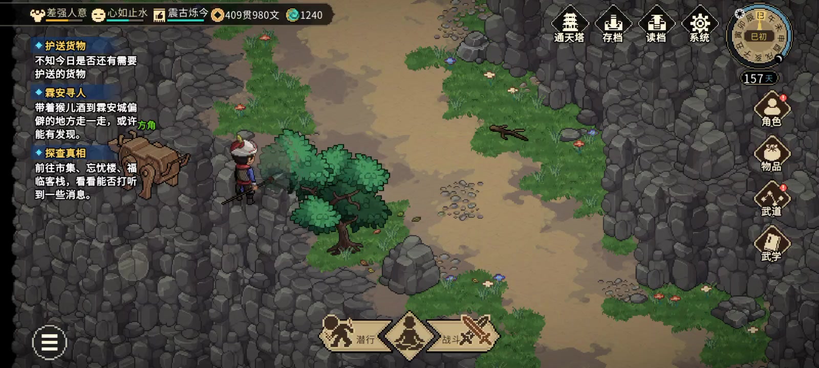 在无名村的测试阶段,选择拳法作为起点无疑能带来额外的加成,为后续的冒险奠定坚实的基础。装备上简陋的大碗、胭脂与一本旧小说。 选择扶起女子,遵循其建议进入破庙,玩家可选择是否学习一本基础的功法。拒绝则能保留铜钱,但将好感 另一边,帮助捕快则能赢得其好感,进入破庙后同样面临功法诱惑,而接受则能提升名声,却也因此树敌燕子窝。 做完后休息4个时辰(然后进入树林觅食在此之前可以将破庙的东西捡一下,捡到的香可