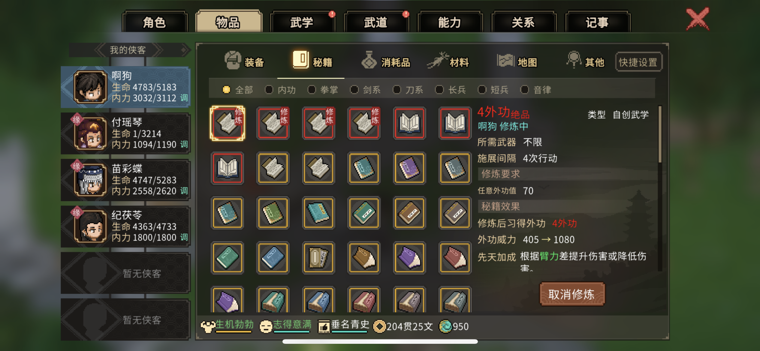 游戏在战斗过程中不使用游戏本身的金色外功(天魔噬魂术吸老蔡除外),不使用金色饰品,装备。开局学紫色内功可以用金牌子装备下,然后骨牌可以带金牌子。最强的武功就是紫色融合紫色。