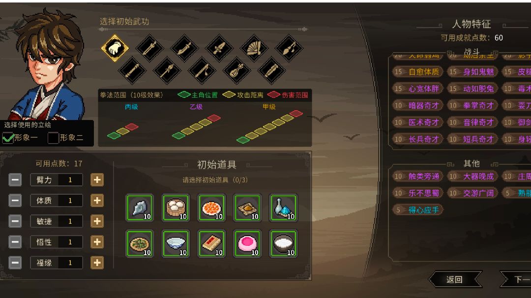 steam上200+小时,给点测试版游玩建议。 开局人物为初始状态,生活技能和成就点数皆未解锁。想要一周目有良好的探索和战斗体验,就需要选对属性和天赋。 由于测试版只开放无名地区,可获得的武功和绝招有限,另外该地区可加入门派除了新手村师父以外,别的门派都在其他地区,所以新手村师父是测试版唯一可选门派。 建议初始武器选拳,天赋天煞孤星(双倍最后一击经验,增伤100%,成就点不够时,这个性价比最高),
