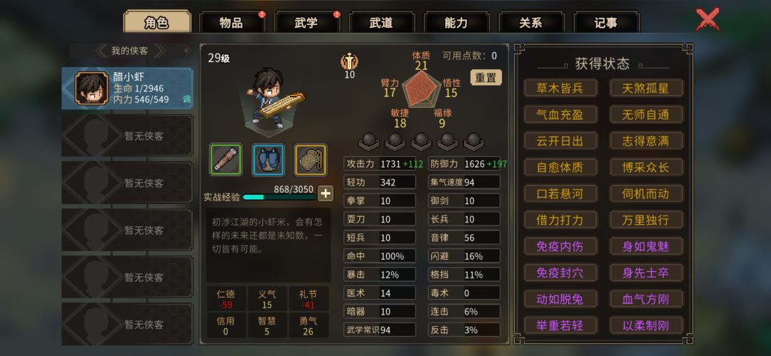 [表情_流口水]没错这个头铁的煞笔就是我 没看攻略 下了游戏就往里冲 打到一半发现自己可能要GG了 舍不得肝出来的几个满级能力 想走真结局保存一下 [表情_流口水][表情_流口水]研究了两天有什么结局适合 最后选择了走天下第一路线 分享给我一样盲目的侠客 注意以下几个点 1.首先就是自己本体虽然弱但是也要尽力练一下 因为时不时就需要单挑 2.走老头门 我们的核心之一就是老头 按图里的来 做血牛#大侠立志传