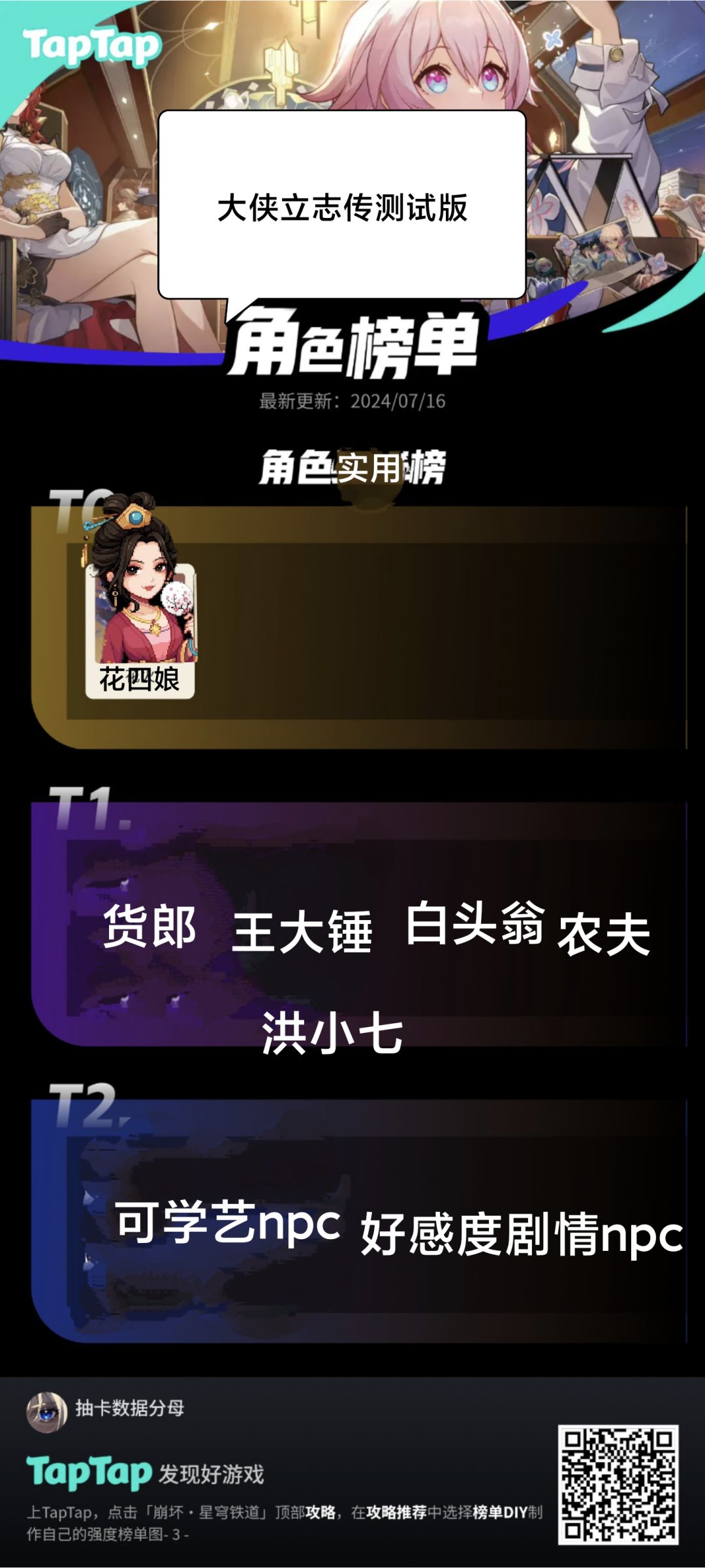 前言:npc好感度达到100(生死)时,你在他那买东西获得七折优惠,卖东西也能得到更多钱,易物貌似不影响。下面进入正题: T0:唯一真神 花四娘:全村最美的女人,喜好化妆品开局可带,售卖的食物可以送给其他npc(入队后免费住客栈) T1: ①货郎:售卖言情小说,茶叶,化妆品等,去送其他npc,喜好物品刚好可以在花四娘那里买阳春面送给他 ②铁匠王大锤:售卖低级工具,可用来伐木挖矿再售卖给商人赚钱 ③