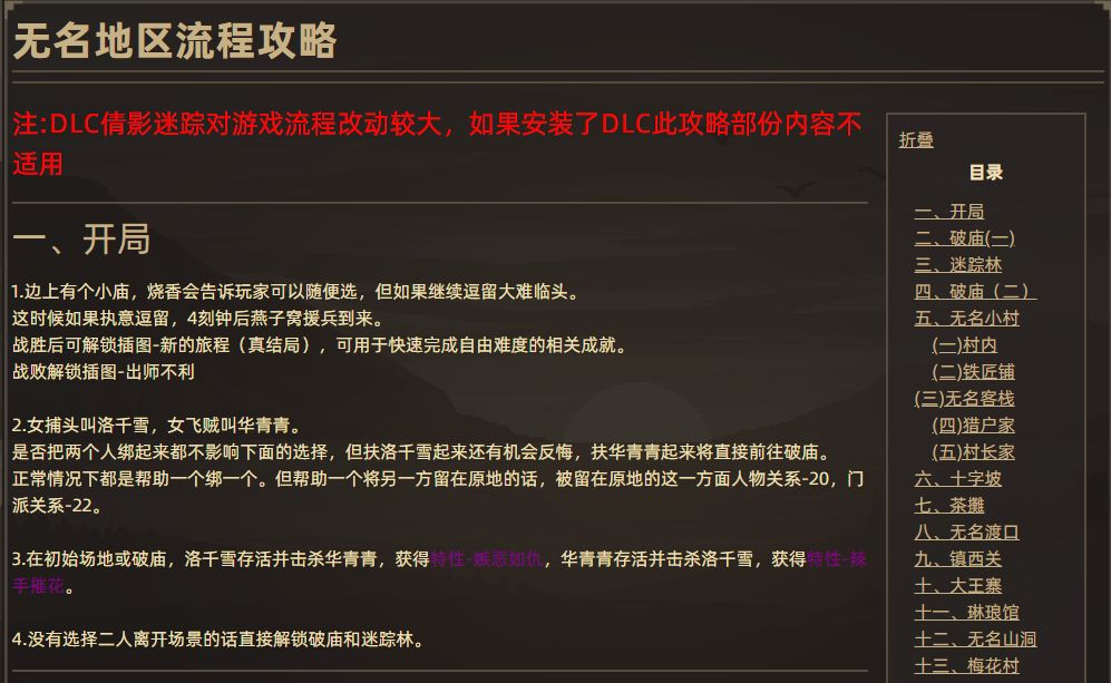 本攻略已收录至WIKI-新手入门-无名地区全教程板块,大家可以在游戏内WIKI对应页面随时查阅 攻略作者:瑠璃櫻 注:攻略主要展示事件路线以及图鉴的获取方式,不会一一注明甲品以下的物品。 一、开局 1.边上有个小庙,烧香会告诉玩家可以随便选,但如果继续逗留大难临头。 这时候如果执意逗留,4刻钟后燕子窝援兵到来。 战胜后可解锁插图-新的旅程(真结局),可用于快速完成自由难度的相关成就。 战败解锁插