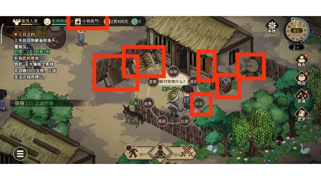 推荐第一次玩的新手选择拳开局(比较友好),当然,想玩别的也可以,但需要晚一点才能加入对应宗门。 粗茶是送白头翁的,胭脂送花四娘,送礼物能提高关系,达标后能触发心愿任务,完成可以邀请对方加入队伍。 注意:迷踪林里面有几个支线,可以看着做一下。 回去破庙交付任务,捕快会让你三天后再来,这时候就可以去无名小村探索了。 如果开局选的是拳,这个功法就能用很长一段时间,性价比极高! 进入无名小村后,支线剧情就