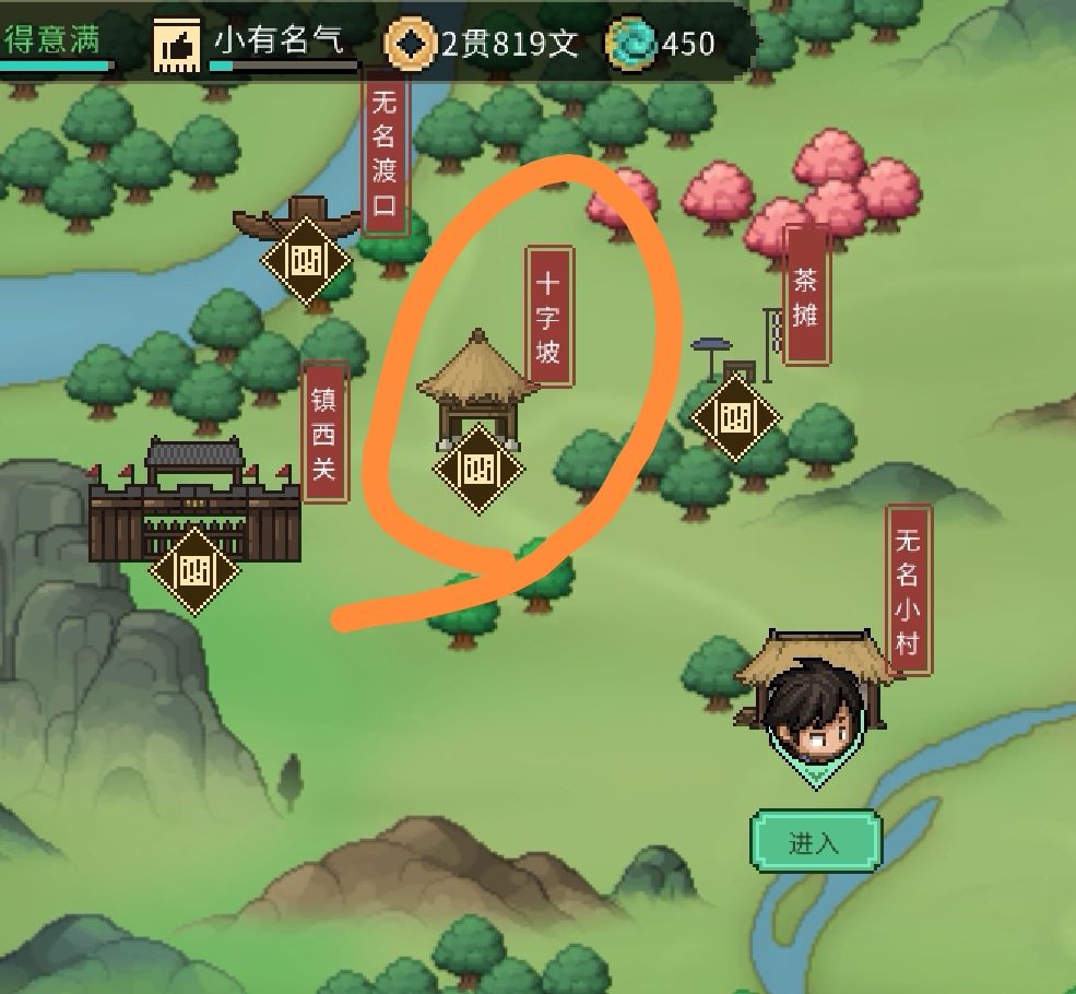 走到图上圈起来的地方,就可以进入十字坡。巳时至未时进去会触发山贼剧情
