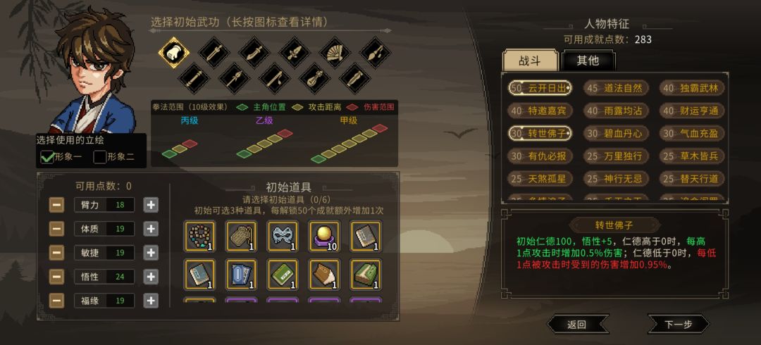 大侠立志传是一个很自由的游戏,本篇攻略意在给大家提供一种思路,帮助大家有一个流畅的游玩体验。难度选择,不建议选修罗难度,目前游戏还没正式上线,本次游玩应该注重体验游戏内容,了解游戏机制,这里我选择了修罗难度,大家不要学我,初始武功选自己喜欢的武器即可,人物特征点出身强体健,把体质敏捷点到十点获得血气方刚和先发制人两条特征,再点身如鬼魅和手脚灵活增加出手频率,初始道具选大海碗、胭脂和糯米浆。 进入