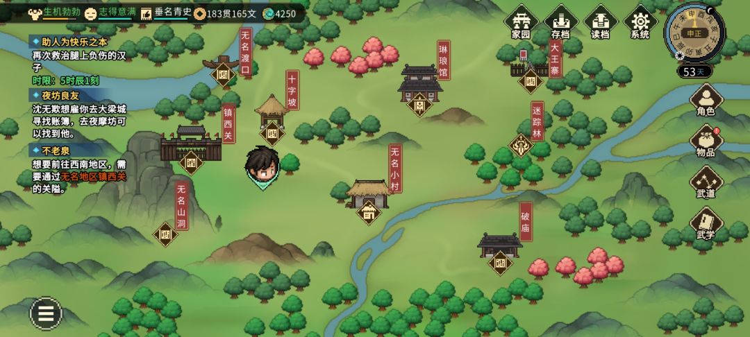 开局时间第一天子初 使用伏牯书后领养方角 不要领养刚烈,不仅是刚烈领养难度的问题,刚烈比方角慢 十字坡 渡口杀富商后坐船到中州大梁城第二天丑初 进入大梁城触发纪茯苓DLC事件强制跳过三个时辰 买酒和铁匠换矿 去神捕门第二天午正 去燕子窝第二天申正 大地图传送到迷踪林 救樵夫后解锁无名小村,到达小村第二天亥初 什么都不做,仅仅考虑路程的时间,开局路线,迷踪林-十字坡-无名渡口-中州渡口-大梁城-神捕