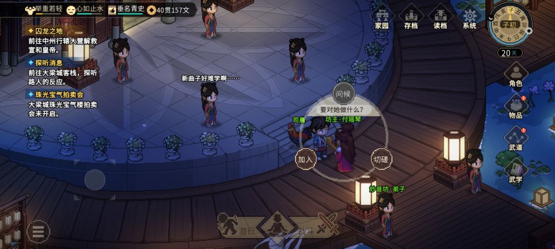 如题,竹园那里战斗跑路送礼,想要属性点没加毒术,后面打完庭院九黎也没开 妙音坊做到救鱼薇儿能开位置,但是那个时候带苗彩蝶进去结不了缘自动触发鱼的剧情,杀完九黎的人就彩蝶直接变死仇了,在家园里她都直接放虫子咬我 而且现在我发现一些问题,就是很多攻略跟当前版本有些细节对不上,有些细节无关紧要有些有很要命,就如题这个,九黎说什么都没用 还有一个刚想起来很重要的一点,亥时到丑时,隐身衣不能过门了!隐身衣不