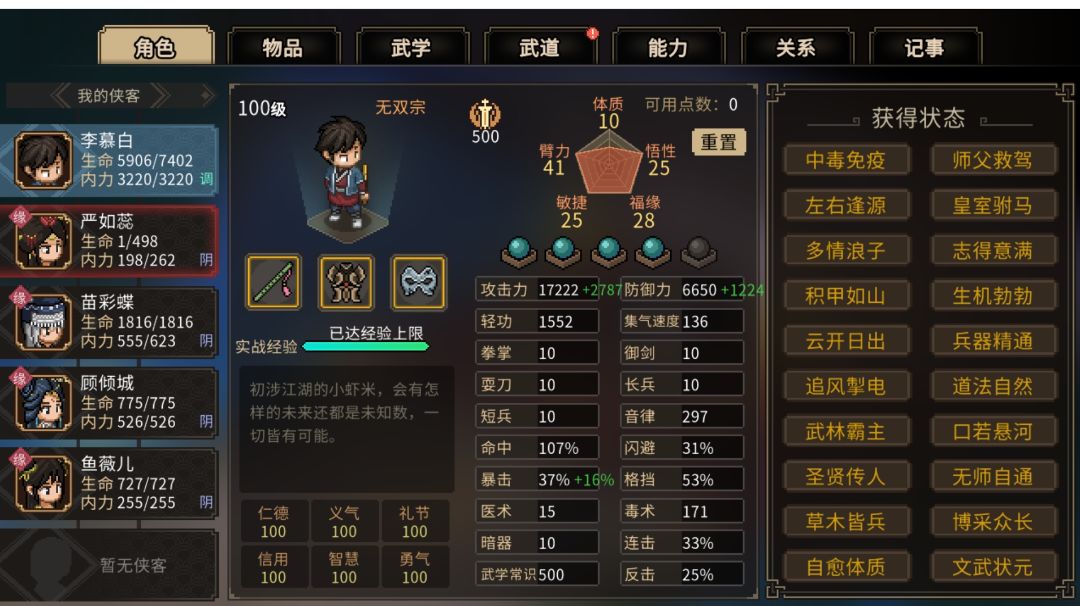 前情提要没有全成就建议不要玩自由!! 首先天赋选择: 橙天赋:《云开日出》《道法自然》《转世佛子》《自愈体质》《万里独行》《草木皆兵》《天煞孤星》《心有灵犀》《文武状元》《动如雷霆》《扮猪吃虎》 紫天赋:《国公世子》《身如鬼魅》《皮糙肉厚》《音律奇才》 蓝天赋:《骨骼清奇》《身强体建》《身强体健》《聪颖灵巧》《福泽深厚》《龙精虎猛》《音律精通》《手脚灵活》 开局第一件事点武道照着上面抄,然后过流程