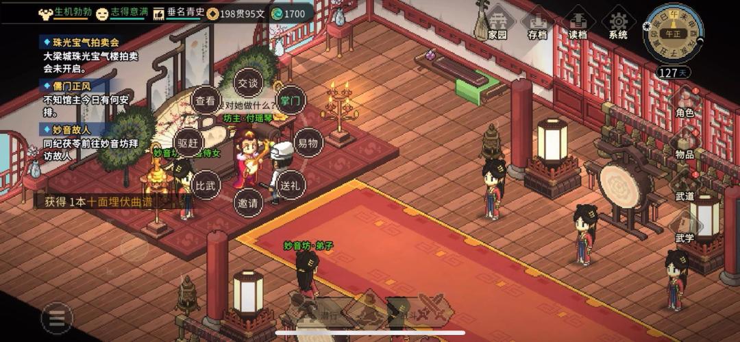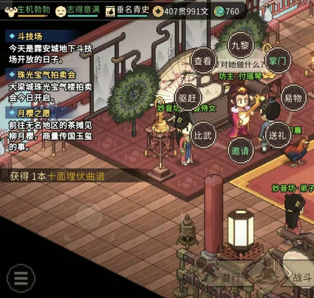 一、解锁妙音坊 完成霖安城群芳馆解谜事件可获知妙音坊位置 僧人身上画:医治破庙旁边的释嗔,送礼易物,暗取杀掉也行,我为了家园buff,就拉进队了 楚馆楼内琴:群芳馆的桌子琴下 棋局珍中藏:珍品阁右侧货架 草贴隐牙门:衙门后面书房书桌 玩家需要音律50以上时,获得焦尾,额外获得惊鸿一梦曲谱 二、刷苗彩蝶好感 前往群芳馆旁边竹园触发苗彩蝶事件 ps:苗彩蝶回到九黎部落我们可以试蛊,每次增加10点毒术并