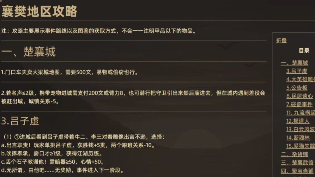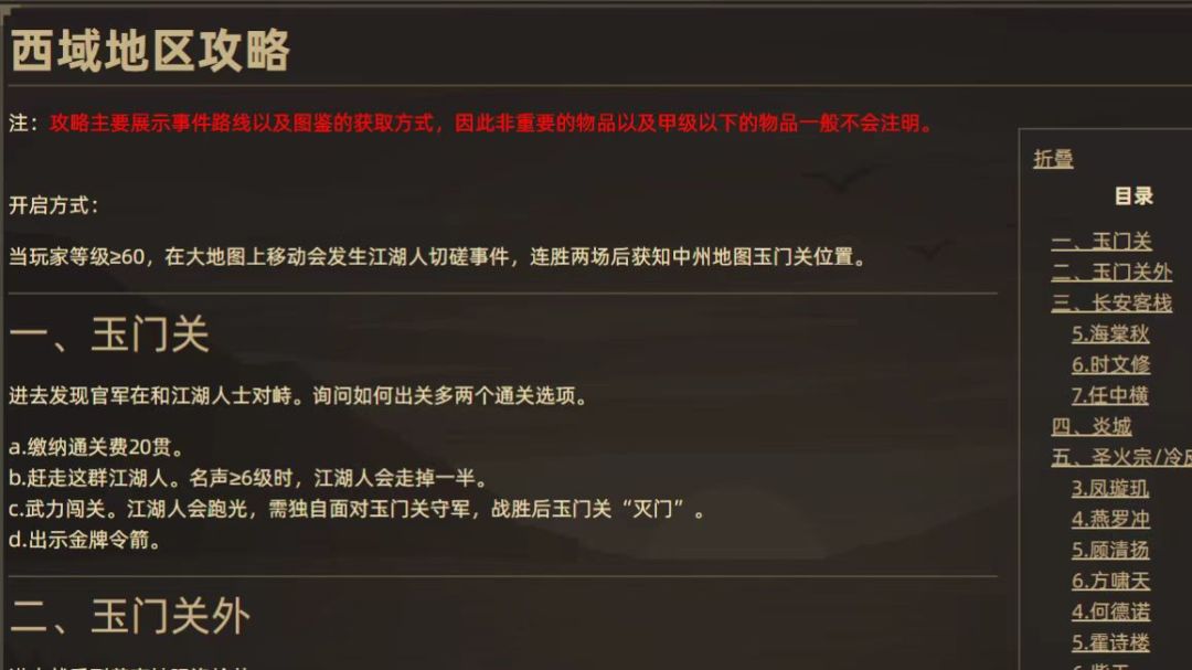 本攻略已收录至WIKI-新手入门-霖安城全流程攻略板块,大家可以在游戏内WIKI对应页面随时查看 攻略作者:瑠璃櫻 注:攻略主要展示事件路线以及图鉴的获取方式,因此非重要的物品以及甲级以下的物品一般不会注明。 开启方式: 当玩家等级≥60,在大地图上移动会发生江湖人切磋事件,连胜两场后获知中州地图玉门关位置。 一、玉门关 进去发现官军在和江湖人士对峙。询问如何出关多两个通关选项。 a.缴纳通关费2