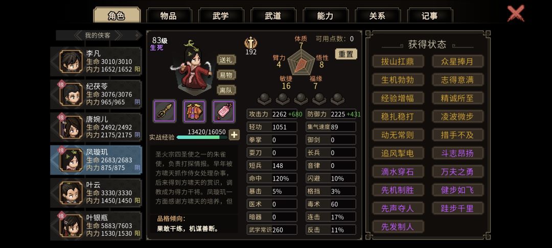 一周目天煞孤星老头门,各种磕磕碰碰刷怪过剧情。在打圣火宗宗主时,凤璇玑老是自己冲上去去被boss反伤反死,而我当时外功内功全金,伤害也只能和boss慢慢刮特别苦恼该怎么办,才能打死boss,并且凤璇玑不死。 突然想到了我在爬塔时,被那些复制人按在地上动不了的情景。 幸好我有一定的收集癖,路上收集了很多情缘和队友,特别挑选了几个带减集气和点穴的。天煞孤星没了的输出靠情缘技能来补,凤玑璇的血量靠辅助来