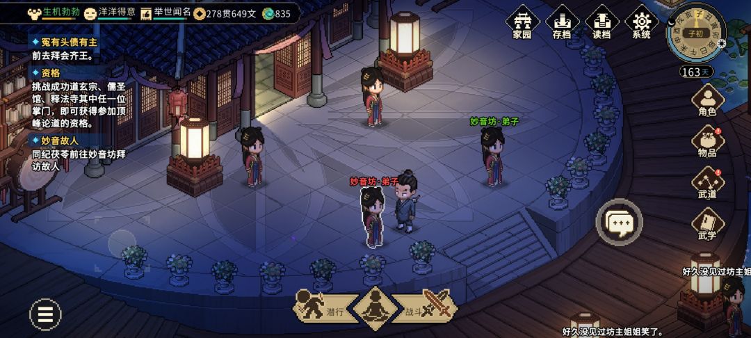 需要苗彩蝶100好感度,隐身衣。 荒废庭院两不相帮,开启九黎。 队友宠物全下了,进九黎直接开战斗,往前走三格,把俩门卫引过来杀,不触发其它九黎人的红名。杀完关系变冷淡,可以直接进入,九黎人不会红名。 做完苗彩蝶的毒龙蛋任务,先不结缘,拉入队,扔家园。 来妙音坊,一样直接开战斗,把门卫引过来杀。子时穿隐身衣开潜行,一路到主楼,进去触发战斗,选择帮助妙音坊。完事就可以自由进出妙音坊了。