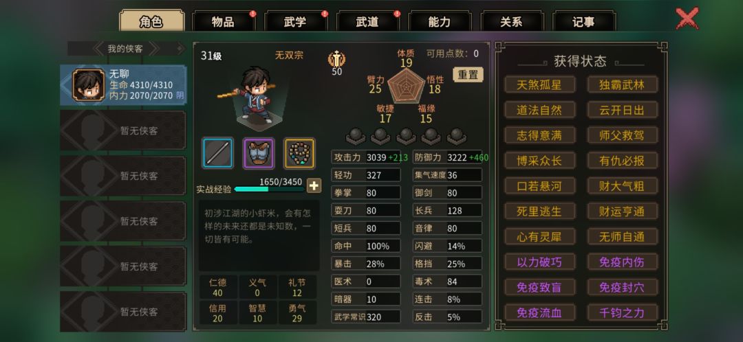 回到无名小村,然后等天亮买好物品直接拉满好感开琳琅馆,然后打完直接拿一本金色内功,再回到镇西关直接全杀了升满,然后回到无名渡口,打完海蛟帮直接出村去霖安城拿云林棍法,至此资源全拿出村,48级,4本金色内功[表情_开心][表情_开心][表情_开心]#大侠立志传