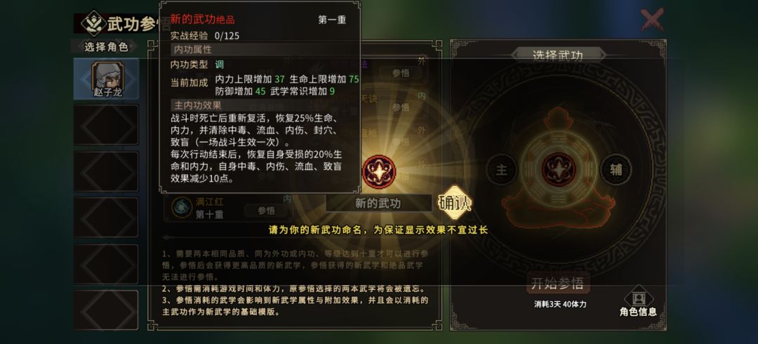 在我们家园悟道林满级后即可解锁参悟武功,在此说明下注意事项: ①两个同类型品级武功(分为主功和辅功两项)可以合成高一级武功,比如两个甲级内功可以合成一个绝品内功,但合成后的武功无法继续参悟,也就不能再用于合成更高一级武功。 ②合成后的武功会兼具被参悟对象的所有特效,但合成的内功的衍生技能只会是主功的衍生技能(比如把九州诀做辅功、祈禳大法做主功合成的武功会失去九州诀的衍生技能归元(上图一)如果二者颠