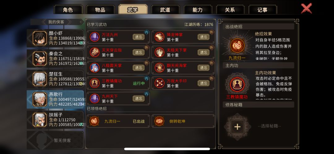 一周目的老头(燕歌行),可以说是“无敌”般存在。就单这“五维”都能让其它伙伴望其项背,更不用说甲级绝技和免费给的甲级武学、装备,甚至买卖甲级书啦[表情_送花]!! 但是,真正去打通天塔时,也会发现这点属性完全不够塞牙缝[表情_坏笑]