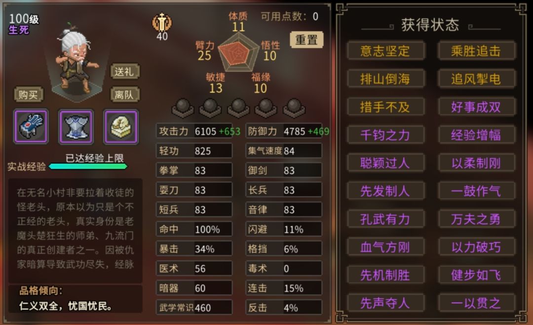 新手玩不知道怎么开局的话,就无脑入九流门,万民掌和九州决,你自己不怎么会培养自己的话队友,前期保姆,就让老头一直跟着(中期一点老头才跟你)挖矿伐木那些一直跟着你老头一百级能有50个属性点,老头满级吃满药,只加臂力的话能到40多,而且开是打就能有九流归一(清兵神器),并且九流门的功法什么兵器熟练度都加,可以让你很好的武器切换(没有草木皆兵的话)