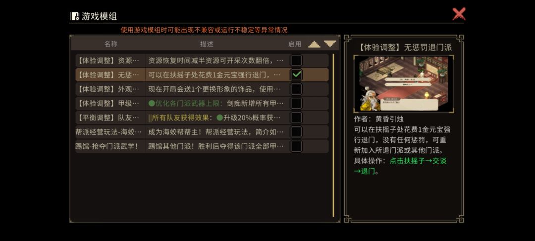 开了这个mod,可以完美退出老头门而且后面可以再进老头门继续做任务(记得选对自己原先的老头门的名字)。 建议打完三教镇魔任务以后(拿到万民掌,不然后面如果加入道玄宗,儒圣馆,释法寺做了三教镇魔的任务,老头门会卡任务进度),再去扶摇子那里退门注意直接在扶摇子这里退门。 不要在燕歌行那里退门(在燕歌行那里退门会扣掉贡献度)。 后续加入各大门派达到自己的目标以后也建议在扶摇子这里无损退门,保留门派贡献度