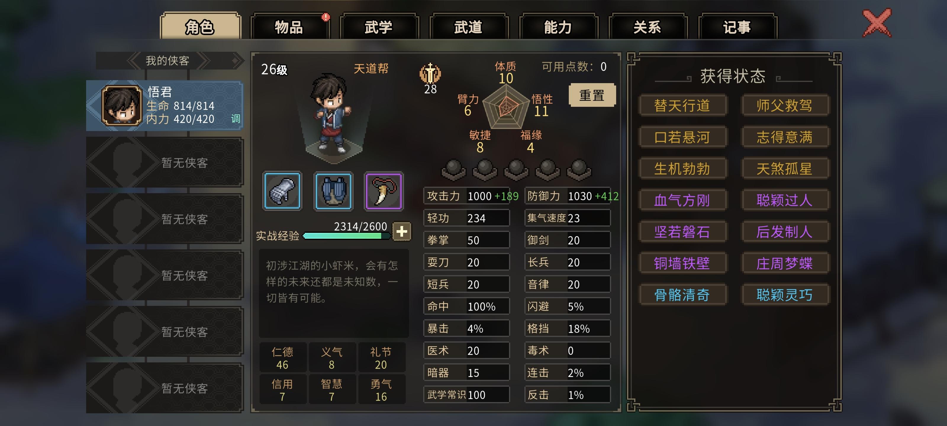 #大侠立志传mod 链接在评论区置顶,部分更新在置顶评论的图片复制到浏览器搜索,删除评论中的文字那些打不开网页的检查是不是多了空格或者多删除了字母帖子只写了部分ID,其它详见文档文档补充了帖子里没有的Buff(不能写太多,不然每次审核很久)特征删改器Mod的问题可以去Mod作者的帖子反馈帖子地址→→特征ID:3404 拳掌奇才 3440 嫉恶如仇3
