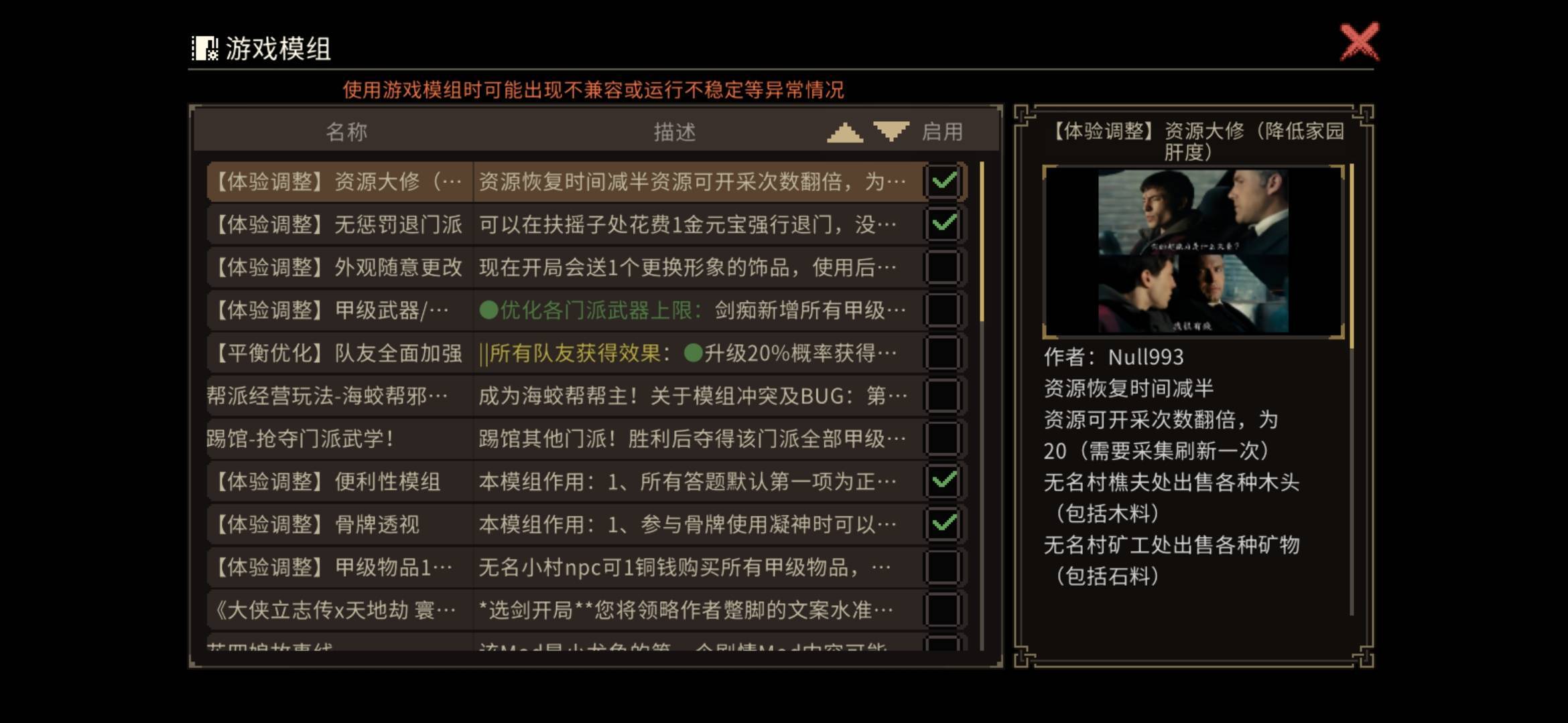 #大侠立志传mod 链接在评论区置顶,部分更新在置顶评论的图片复制到浏览器搜索,删除评论中的文字那些打不开网页的检查是不是多了空格或者多删除了字母帖子只写了部分ID,其它详见文档文档补充了帖子里没有的Buff(不能写太多,不然每次审核很久)特征删改器Mod的问题可以去Mod作者的帖子反馈帖子地址→→特征ID:3404 拳掌奇才 3440 嫉恶如仇3