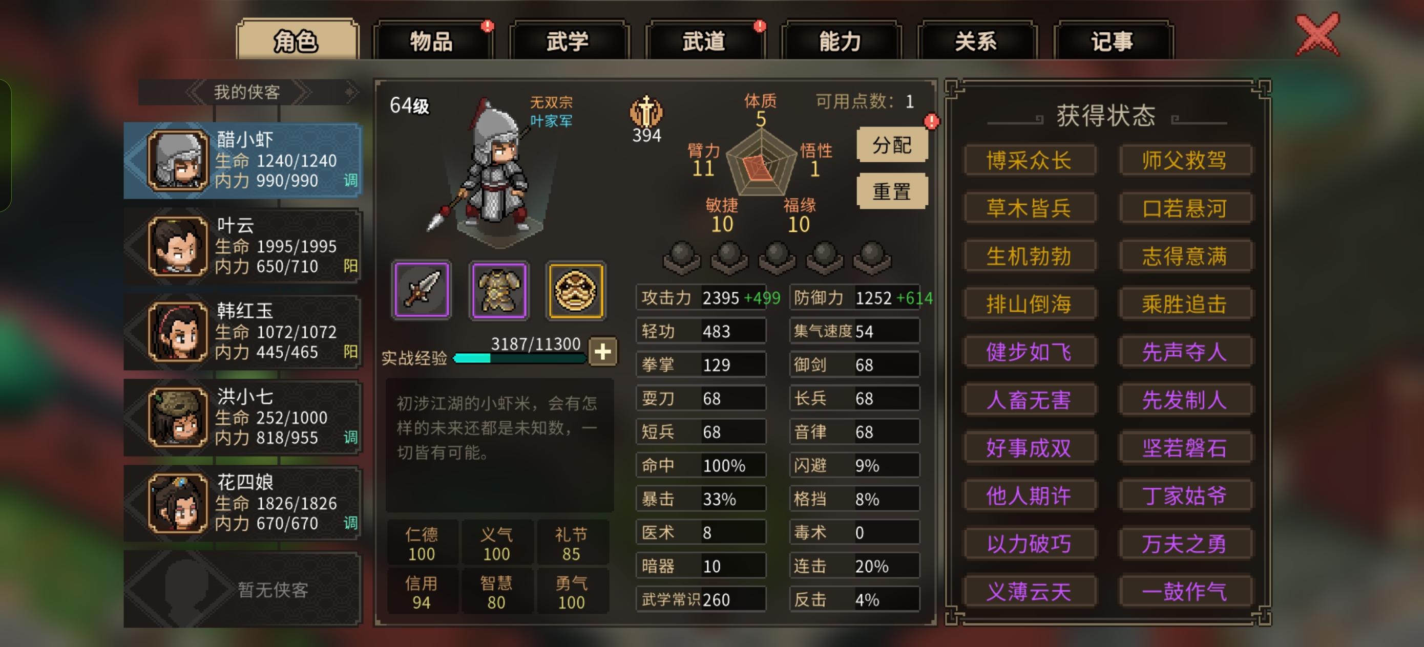 一周目不懂事,开局天赋武器全选了剑相关的,看臂力加伤害的直接无脑全堆了,现在发现好多高级剑法都是敏捷差