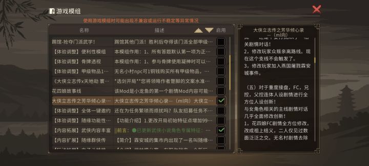 我说我陪着月樱逛完怎么莫名其妙的就满好感了,包括妙音坊和大梁城都满了,我一看模组,原来是加了这个,我仔细看了一下上面写的,这个游戏剧情这么多不好的地方吗?我记得之前看黑盒评论里还有说牛的,不过我之前玩的时候好像没有太注意这些细节啥的,玩的也挺开心,谁人设崩,有啥问题我都没注意,可能是我没带脑子玩,就纯自嗨刷级享受武侠情节了