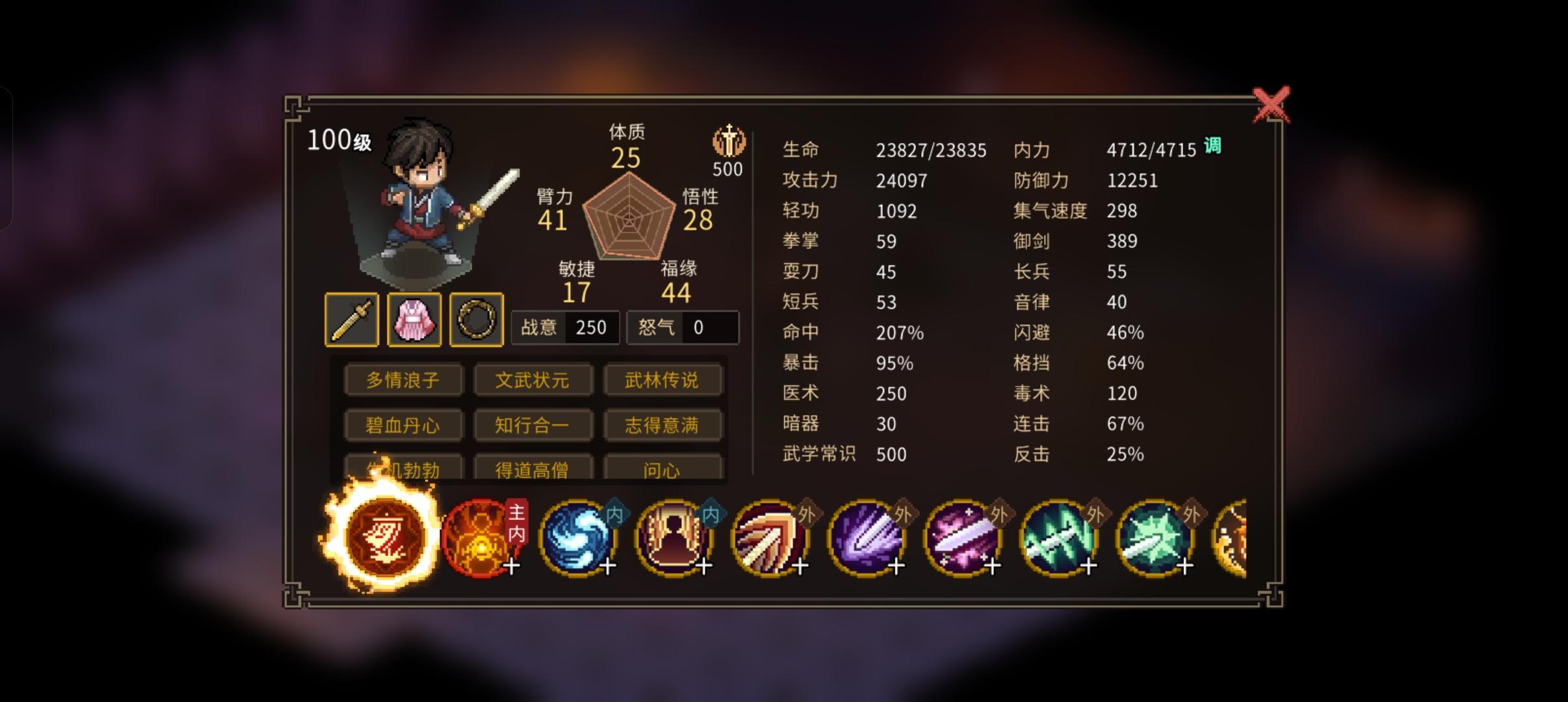 有没有大佬帮我看看我这个面板加武学应该怎么打赢这个牛鼻子老道还有什么地方要提升的吗?一直被秒,要疯啦(PS:还有我这个武学面板一直有小红点,一直消除不了,也没有什么地方要点的,是Bug了吗?)##大侠立志传 #萌新求助