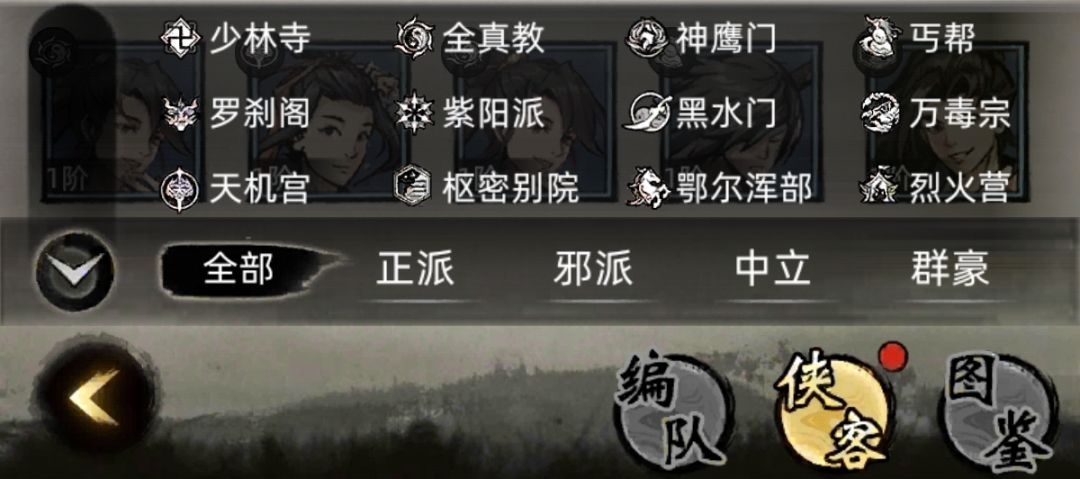 九州江湖情0.1版本补充攻略(会持续更新) 侠客概论:阵营分为正派/邪派/中立/群豪 0.1版本补充:强势的侠客只有群豪,个别有用的阵营特点会在以下的版本补充中说明,这个攻略只看版本补充的文字叙述就行,其他的是老版本的攻略,懒得删了,可以随意看看。阵营侠客又细分为掌门/长老/大弟子,掌门属性成长最高,长老次之,大弟子一律视为狗粮用来升阶用的材料。 正派:分为四个门派,少林/全真/神鹰/丐帮 少林