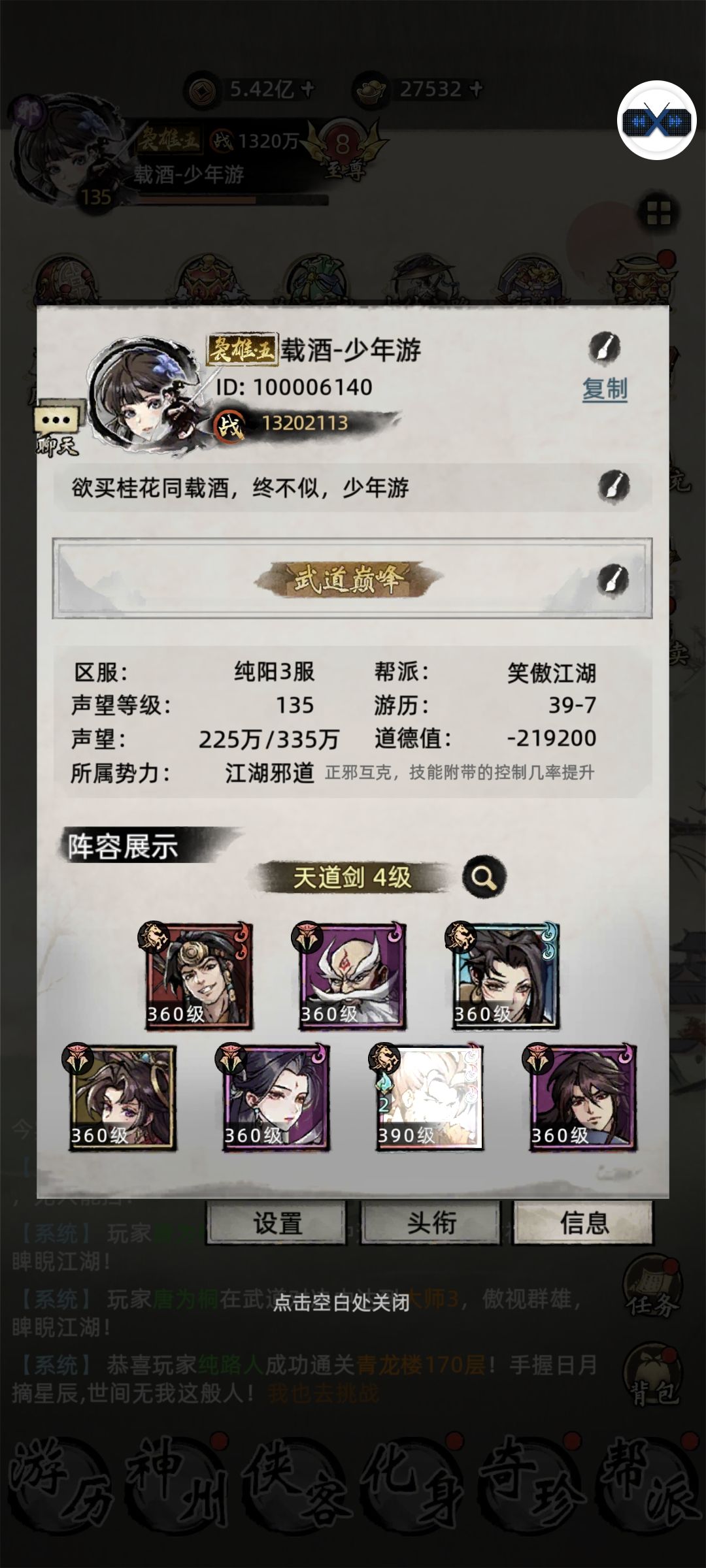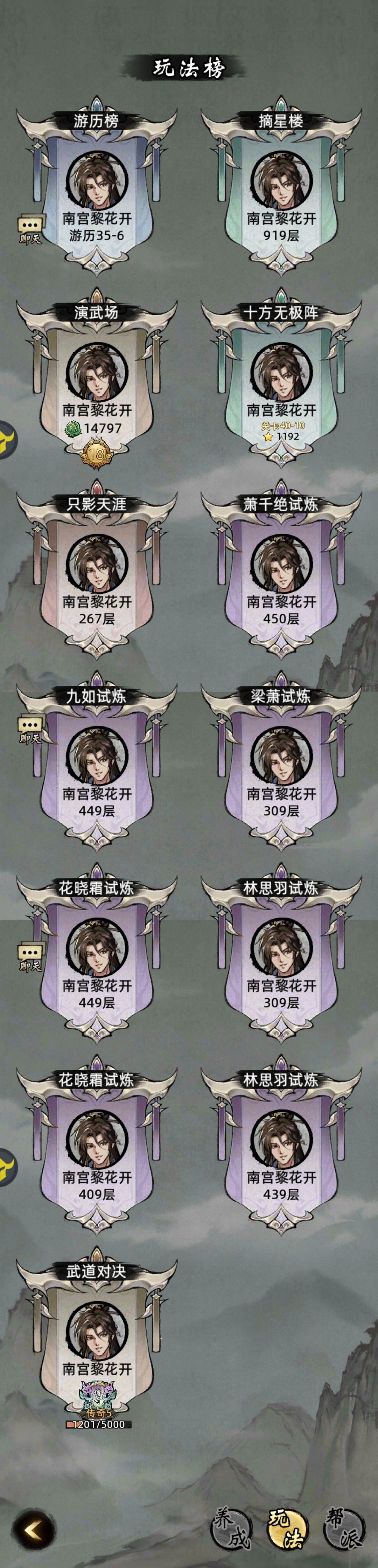 服务器:天机88服 ID:100118XX8 记录: 版本将大更新,一代版本一代神!前面的阵容规划已落伍望君知晓! 首要等级最重要(就是7侠客升阶),其次氪金优先主C核心珠(抽群豪贴送绝品珠),再储备一个主攻群豪优先学满功法,然后才是饰品(过来人的忠告),秘宝没涉及到高阶秘宝(实力不允许)不好建议; ①声望107级宝图全开5级; ②十方1300星可领红色珠子箱,游历满副塔满十方满名侠满还不更新,奇
