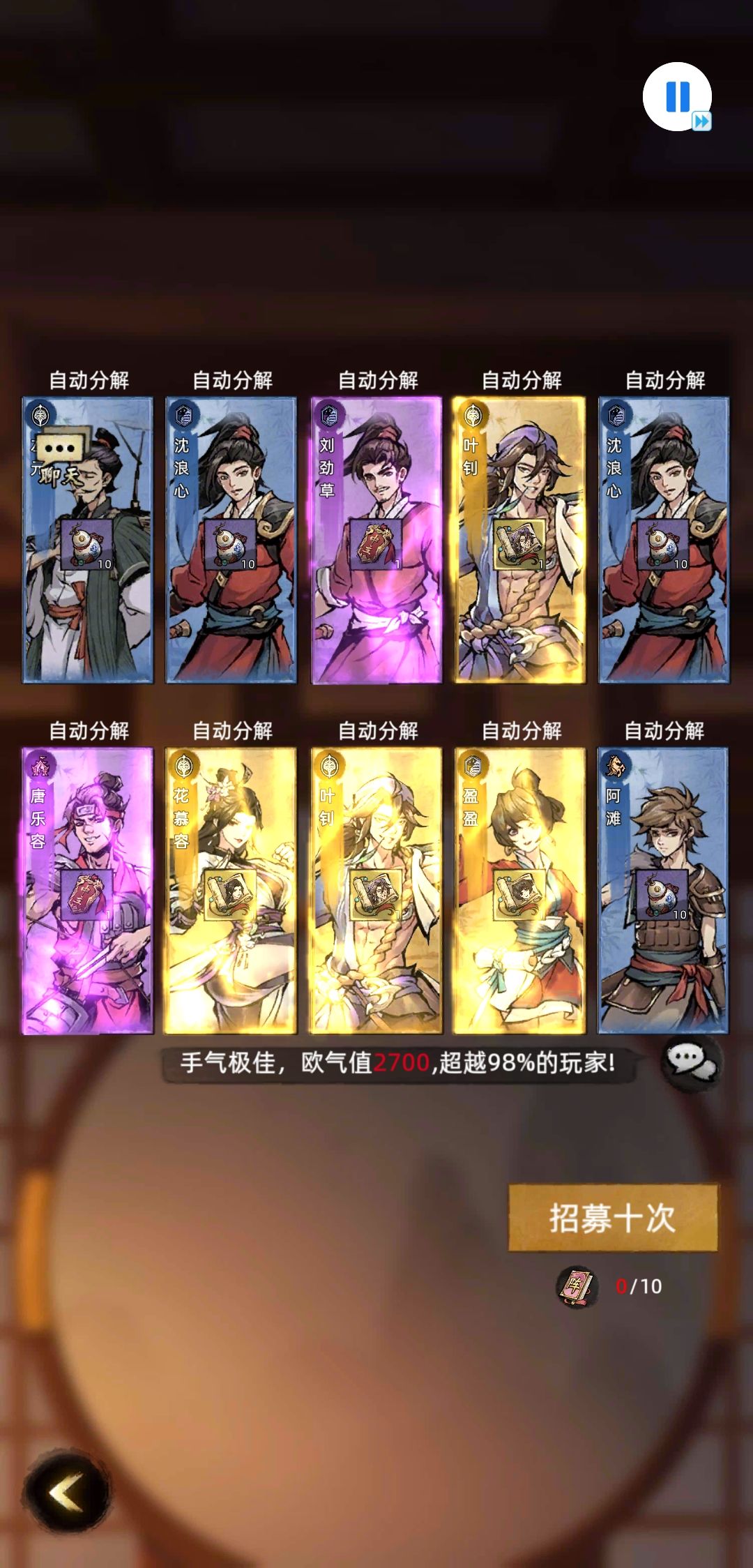 第一次写这个东西,先说这个游戏 1、美术 好的点:侠客立绘纯正的国风,对于我这种对那些二次元画风不感冒的人来说太好了,很有江湖味,大部分侠客都很有特点,很有辨识度; 不好的点:品质低的侠客立绘重复,有点敷衍了,还是补齐比较好;还有些侠客明显想用金庸的名字,估计怕被版权起了个擦边的名字,像萧锋、洪七这些,不过可以理解;还有一点就让我不能接受了,好几个侠客立绘不符合原著,萧锋拿的九阶棍,萧千绝明明是个
