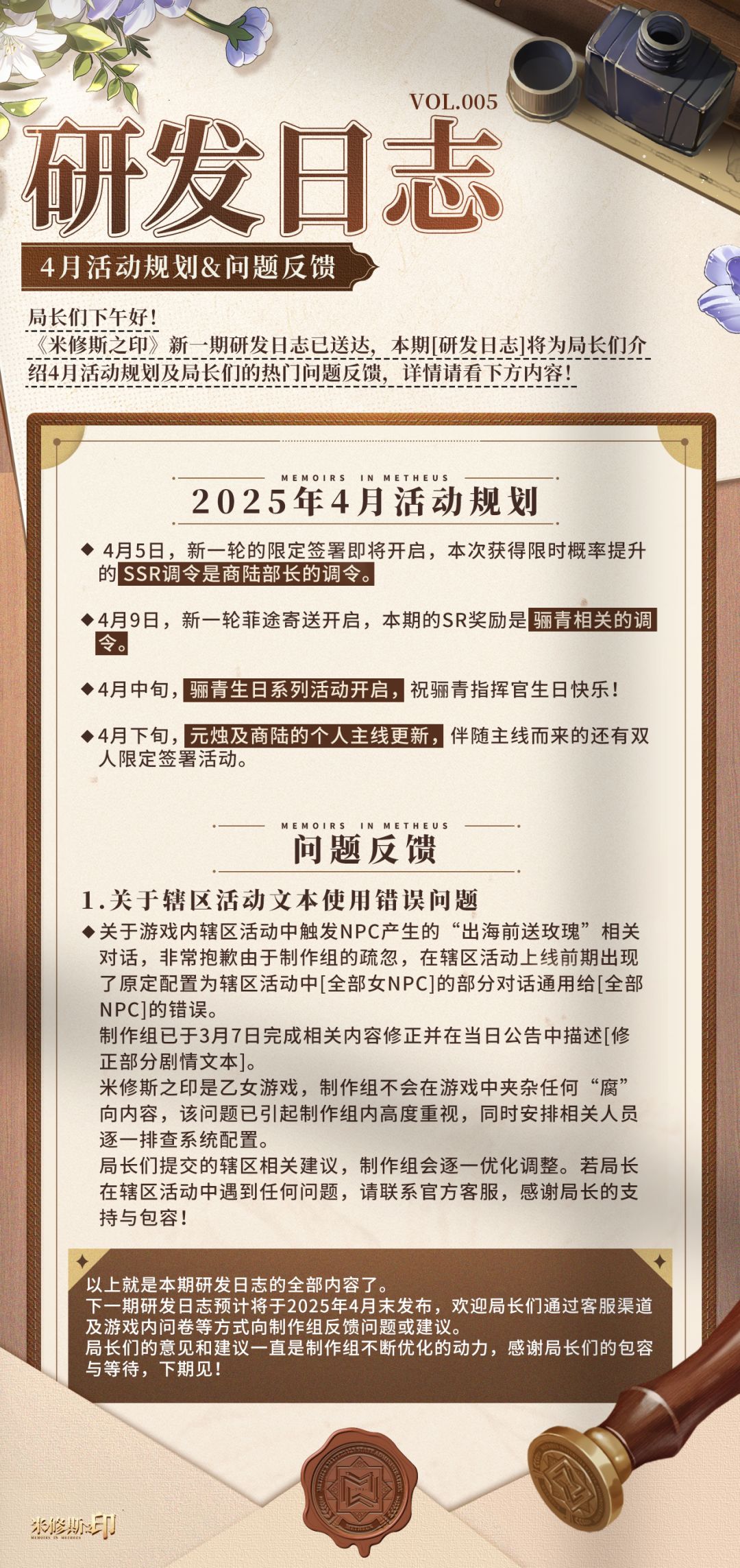 亲爱的局长,从今天开始,“代号:焦土”正式更名为“米修斯之印”。 从2020年9月立项开始,我们便对这一天翘首以待。 我们自黎明启程,经历无数破晓,又在雨夜与局长相识。 在过去的三次测试中,我们收获了许多建议,并受益匪浅。为呈现更好的作品,我们笨拙而不懈地一次次推翻已有的内容,重绘卡牌、重绘立绘、重修策划玩法方案、重塑世界观设定,尽管一路走来诸多艰辛,但想到有各位局长的期盼和等待,我们始终心怀勇气