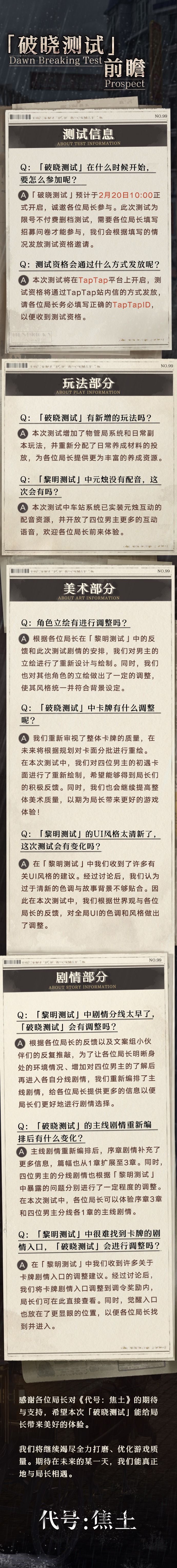 感谢各位局长对《代号:焦土》的关注与激励。 自「黎明测试」结束后,项目组的小伙伴认真收集了各位局长的反馈,并据此从多个角度对游戏质量进行打磨、优化,以期为各位局长带来更好的游戏体验。 「破晓测试」即将开启,对于「黎明测试」中各位局长的建议与疑问和本次「破晓测试」的相关信息,我们都将在此进行统一回答。 --------------- ♦预约通道 《代号:焦土》现已开启预约,可点击链接前往: ♦官方玩