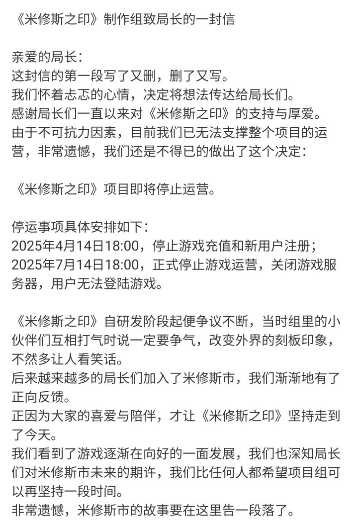 乙游《米修斯之印》宣布将在2025年7月14日关服,原因是“由于不可抗力因素,已无法支撑整个项目的运营”。游戏在2024年10月17日上线,预计共运营271天。