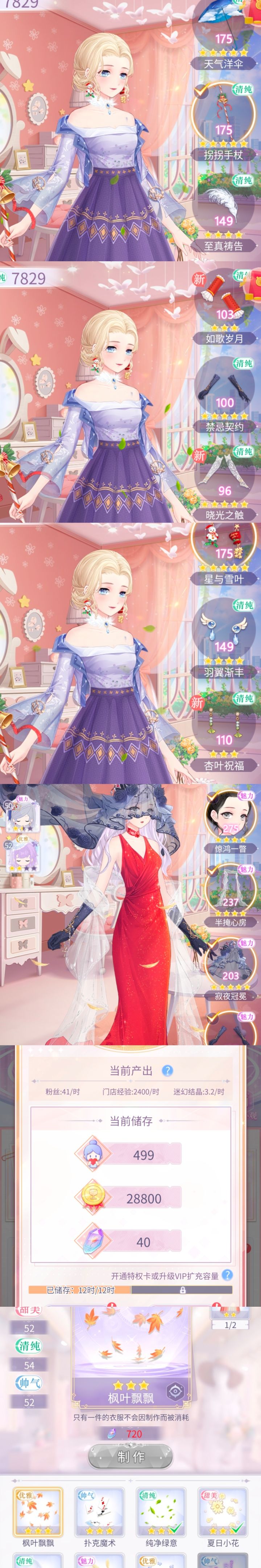 衣服有五个属性;在制作工坊做齐一套服装可以召唤一张卡;卡片的升级和升星各有八个副本,分为普通和高难;卡牌升星后会有一套换色