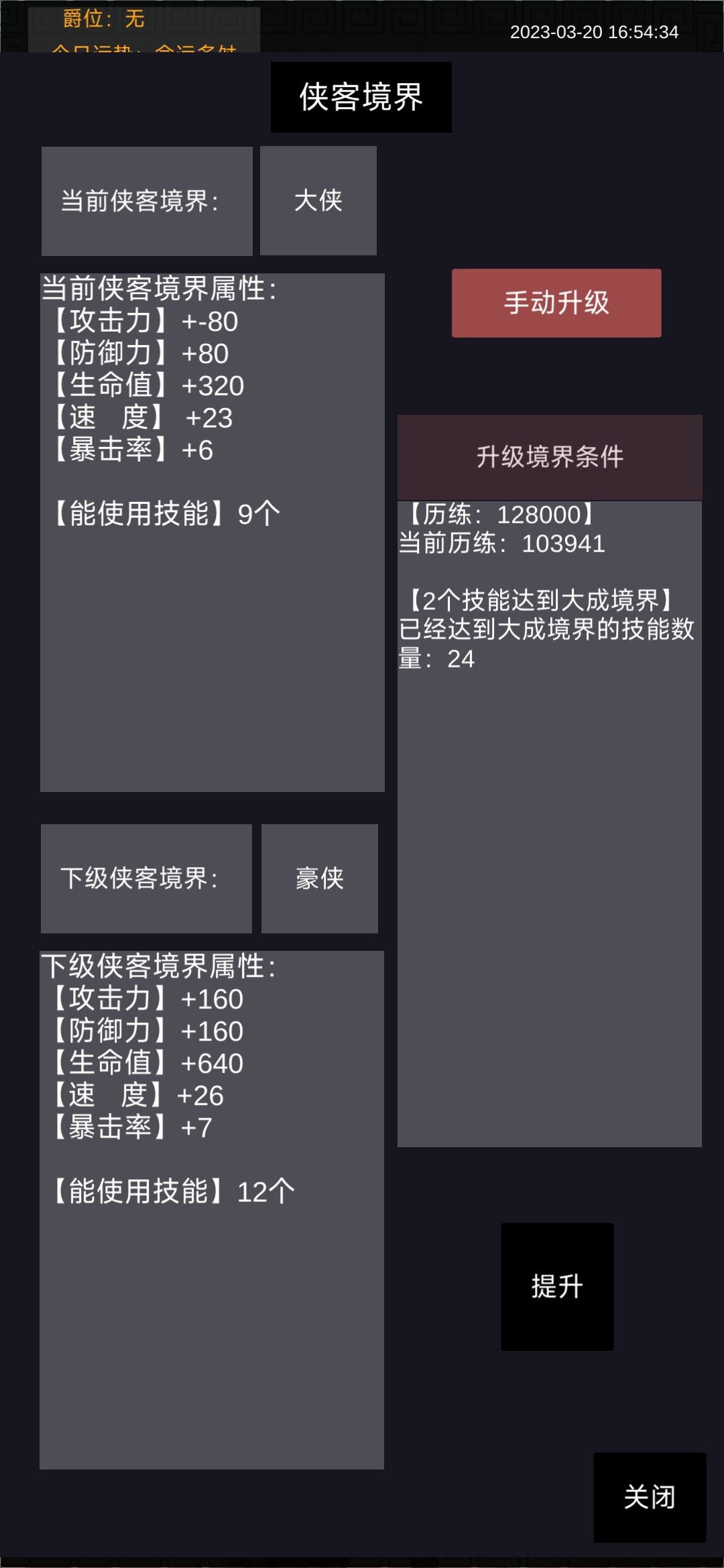 版本1.803 反馈:这个单机,大侠境界出现负80。无技能,无装备,只有经脉提升2%攻击力。未升级到豪侠,后面不知道会修正好不! 一个未修炼到宗师的攻略:注册一个网络版为大号,单机版为小号。 第1步,领礼包,2022165 exp expexp dzexp money equips。 第2步,进柳家堡如下 1. 史诗 2. 武皇 3 元楚 4 金 5 肖枫 6 铁齿门 7 丙 8 丙 9. 丙 1