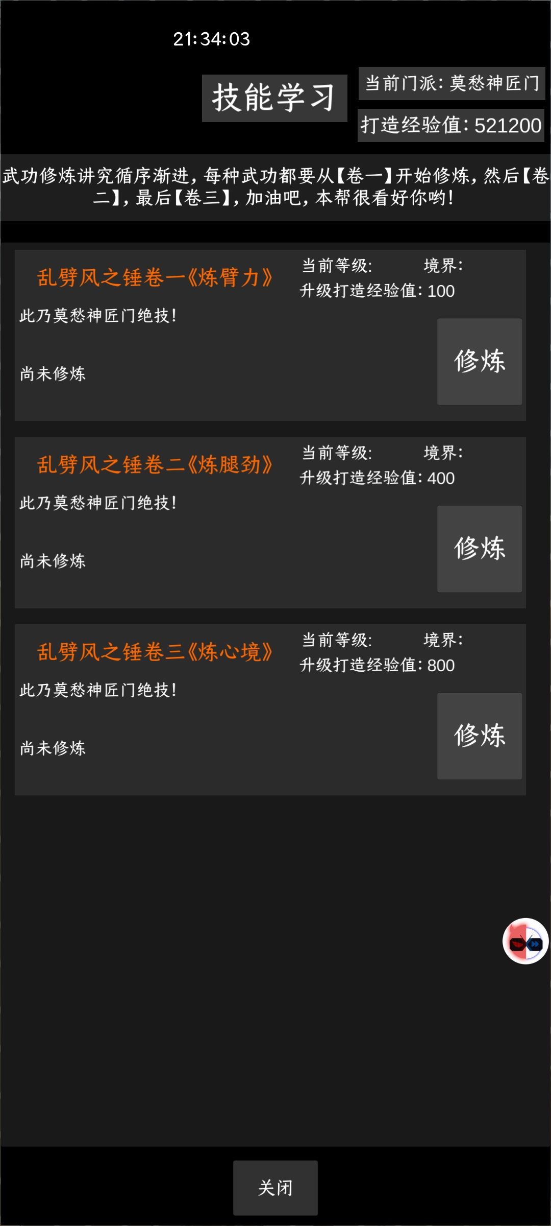 【升级攻略】 1、进入游戏仔细看看新手指引和侠客手册,把礼包码全领了,不知道的话先进官方QQ群艾特q群管家,然后把礼包送的装备配齐一套金之力(四金一土),这样可以直接去打普通第9图,要注意的是:先把侠客等级升到【米侠】再去盖帮学技能,否则先学技能用完了历练就没法升级侠客等级,然后就无法上阵技能了(江湖小白是不能上阵技能的),不过问题也不大离线挂机一会儿就有历练升级了。可以把剩下那些史诗装备回收金元