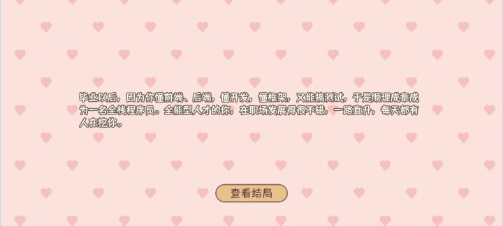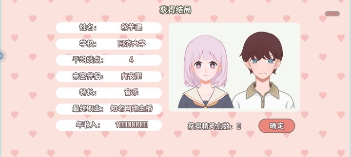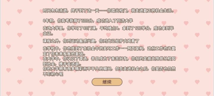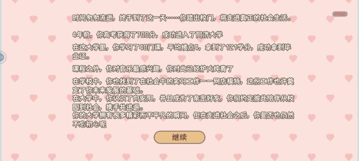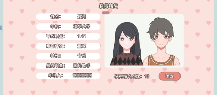 本来以为会成为明星,最后成为知名网络主播1000万年薪。我丢(个人几乎)肝了三四个小时才整完,所以感觉只能给四颗星,太累了,因为本人还在高中所以也是很想玩一下这个大学模拟器所以玩的很认真,每个学期都尽量的拿了第一(成绩),我玩的在音乐方面是下了很大的功夫的,在各个方面都做了超过100的全属,有的200,300,所以建议把考试要通过了,最好拿到全班前三(第一是最好的)有很大的奖学金,要每周去参加一下社团活动,当然要按照自己属性高低去了,我在这个游戏中当了学生会主席,一步一步走上来,参加学生会也还不错,能增加声望,最终之重要选择一个方面着重发展(体育,绘画 音乐之中,方便后期社团活动,因为能得奖)前期去打工一会,然后攒钱去学习技能,然后参加比赛获得奖学金就可以不用怎么打工了。。还有个很赚钱的方法,(提前好有关系很多个100)就是举办活动,我举办的最大的活动赚了一万多,最小的几百,在举办活动的途中也可以增加好有关系,每周一定要去赠好友送东西,既不花费体力还能获得好感(前提是有点小钱)然后每周记得去按摩