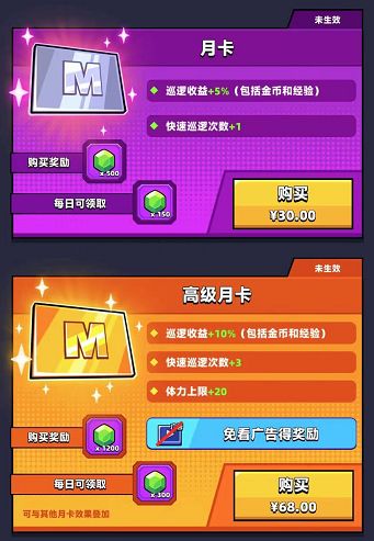 本文首发【蛋壳特工队】公众号,未经授权禁止“,抄袭文章”转载至其它平台。 前言 “ 哈喽,大家好本期小编XM给大家讲一下弹壳特攻队有什么值得购买的道具,对大家的提升有多大的帮助。” 这两张月卡都是挺推荐大家买的,强烈推荐大家购买高级月卡对大家的提升很大每天多三次快速巡逻的次数体力上限增加20,附送的免广告得奖励也可以为大家省时间,还有一点是对大家七天嘉年华绿宝石任务有一定的帮助。 通过挑战关卡累积