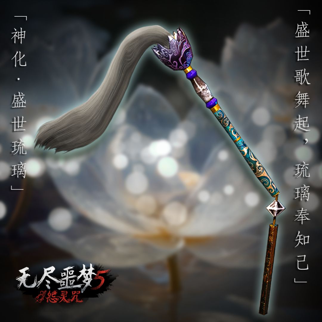 「拂尘·盛世琉璃」 传说由天庭之琉璃和白马尾所制的拂尘,挥动时彷佛能够听到万马奔腾。 琉璃亦称作“五色石”,乃是极为稀有之物。日光直射琉璃时放出七色之光,仿佛盛世降临。 「盛世歌舞起,琉璃奉知己。」
