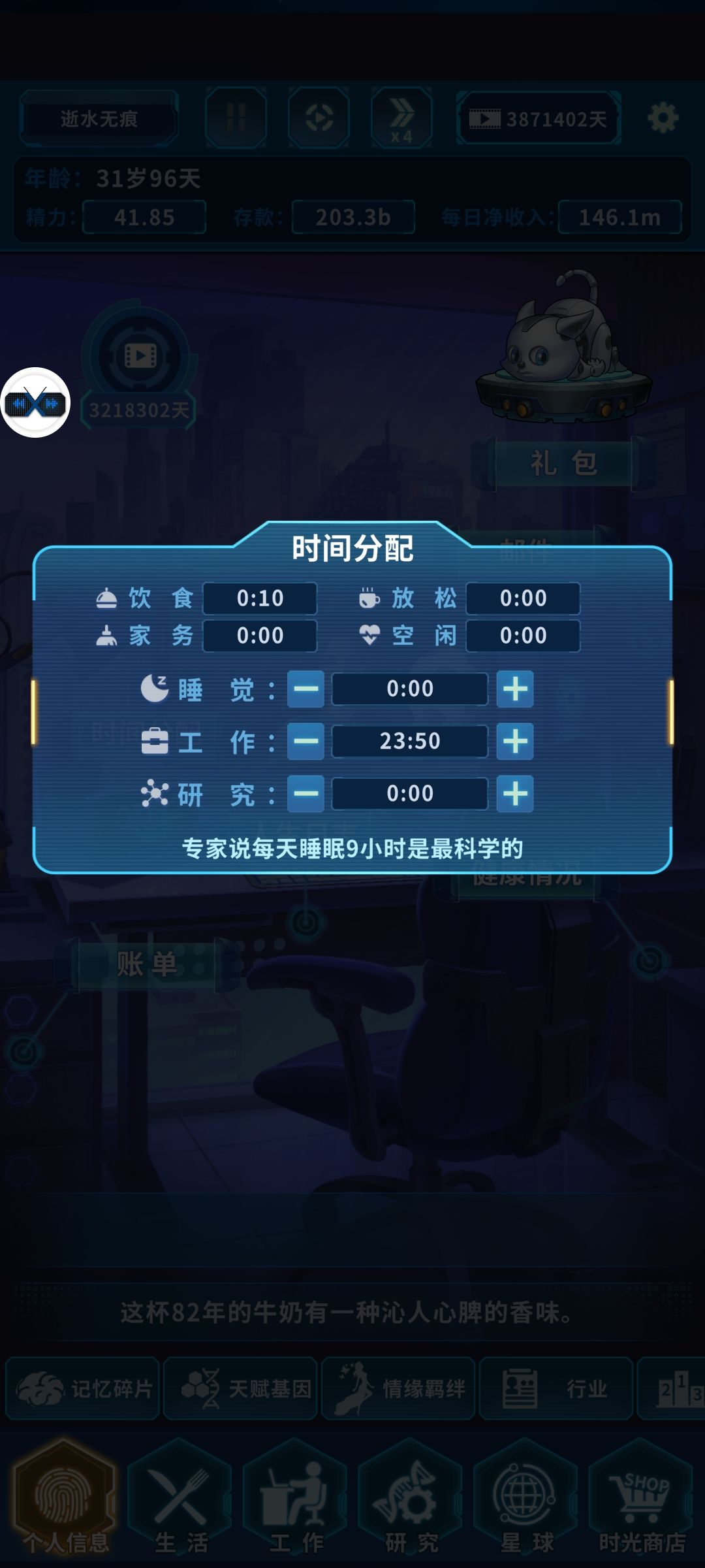本游戏引导机制死板.扣钱(收租)地方M多.不小心就破产了或对存款来原方式不对...而且是真不对(图一)不用睡觉的..这DM谁能想到.......90年不用睡觉都不会死了(轮回)只会影响健康指数(以后睡觉二年9小时就全补回来) 本游戏是以轮回系数叠加倍速来完成高难度任务.赚钱速度.就是超时空系数=工作倍速和研究倍速 研究最高5000级=(500+1)×超时空系数 工作最高2000级=(200+1)x