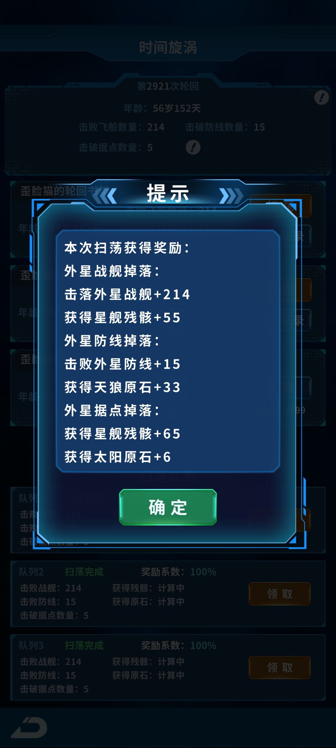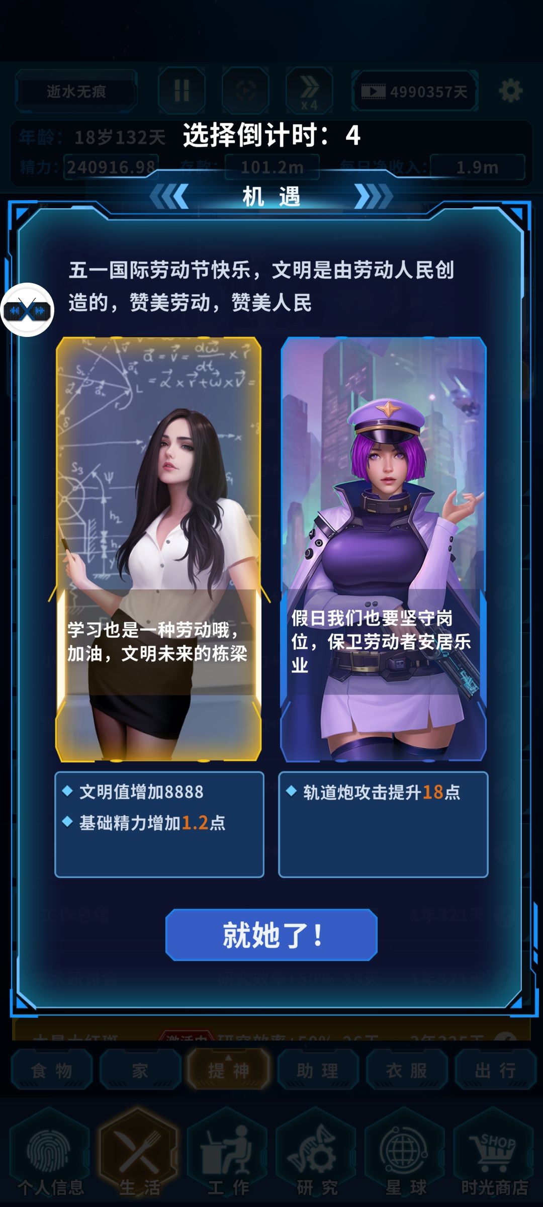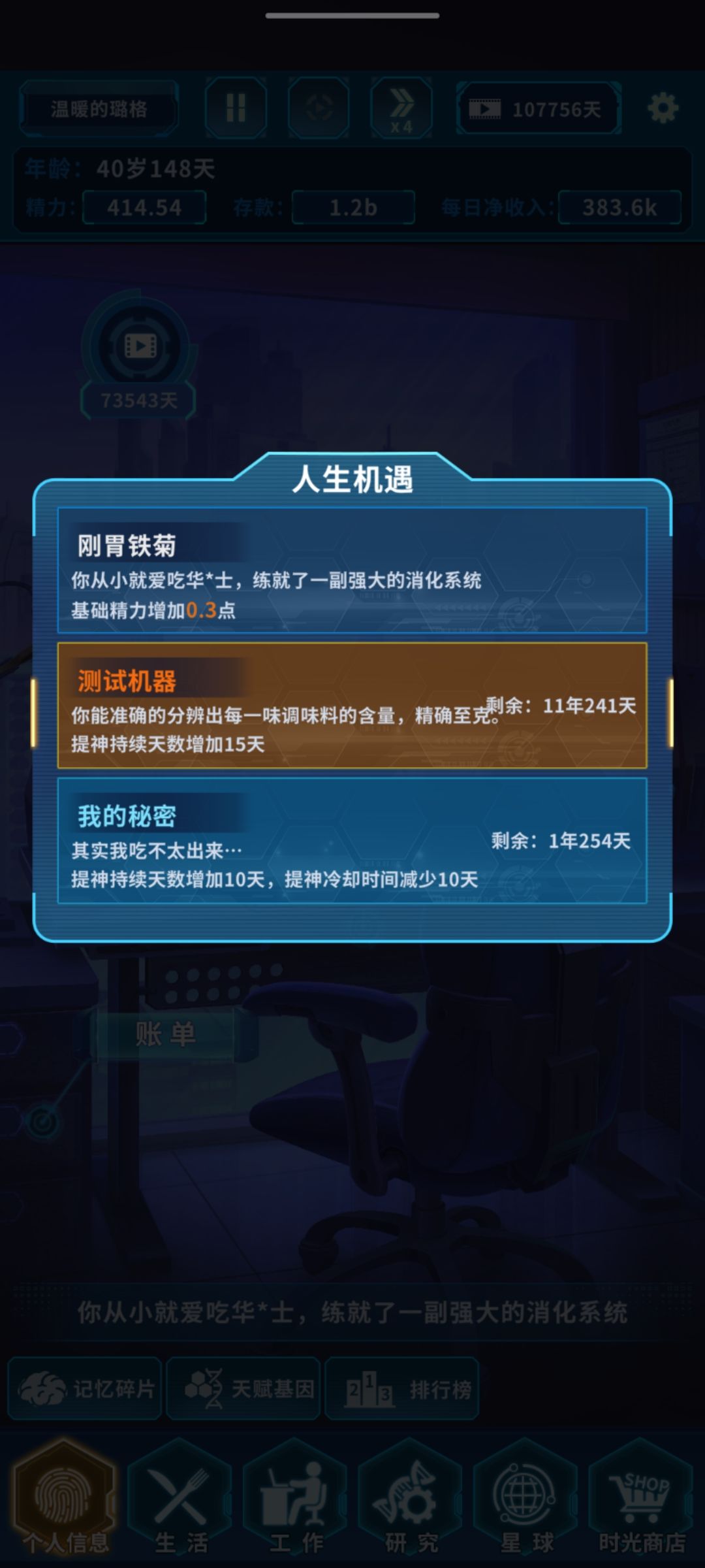 本游戏引导机制死板.扣钱(收租)地方M多.不小心就破产了或对存款来原方式不对...而且是真不对(图一)不用睡觉的..这DM谁能想到.......90年不用睡觉都不会死了(轮回)只会影响健康指数(以后睡觉二年9小时就全补回来) 本游戏是以轮回系数叠加倍速来完成高难度任务.赚钱速度.就是超时空系数=工作倍速和研究倍速 研究最高5000级=(500+1)×超时空系数 工作最高2000级=(200+1)x