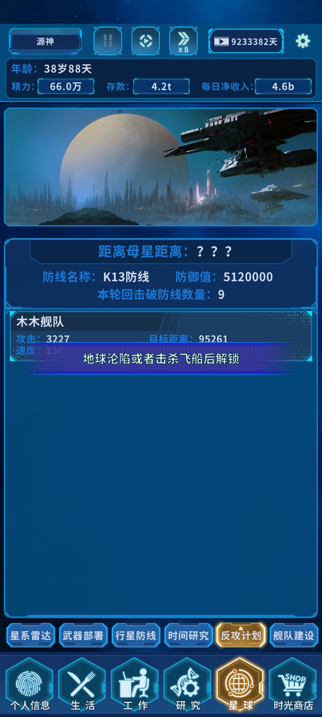 书接上文。本篇为大佬篇,目标玩家为已轻松解锁舰队,正在突破自我极限的玩家。 3.1. 学会闭关。所谓闭关,是指在把工作收入科技拉满后,每天不睡觉不研究,吃最少住最便宜,以最大化收入的操作。闭关5-10年可以获得大量存款,之后依靠投资收入就可以不工作了。后期防线建造动辄上百b至几t的钱全是靠投资来的。通过闭关可以大幅度缩短资本积累的时间,而游戏后期卡脖子的主要就是造防线的钱。学会闭关相对于不闭关至少